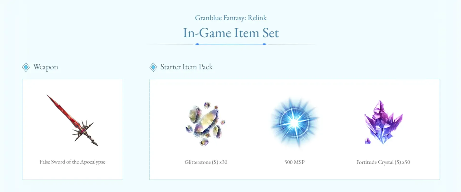 Granblue Fantasy: Relink - Special Edition Content: • Granblue Fantasy: Relink Game • Weapon: False Sword of the Apocalypse • Color Packs 2 and 3 • Starter Item Pack (Glitterstone (S) x30, 500 MSP, Fortitude Crystal (S) x50) • Granblue Special Item Set: Relink Pack* (includes "Main Character Outfit: Rebelwear" x1 and "Eternals' Transcendence Set or Evokers' Domain Set" for the Granblue Fantasy mobile/browser game) Additionally, pre-orders include the following benefits: • Stamina III and Enmity III Sigils* • Early Access* (planned for January 28, 2024) * Available only for the PS4/PS5 version.