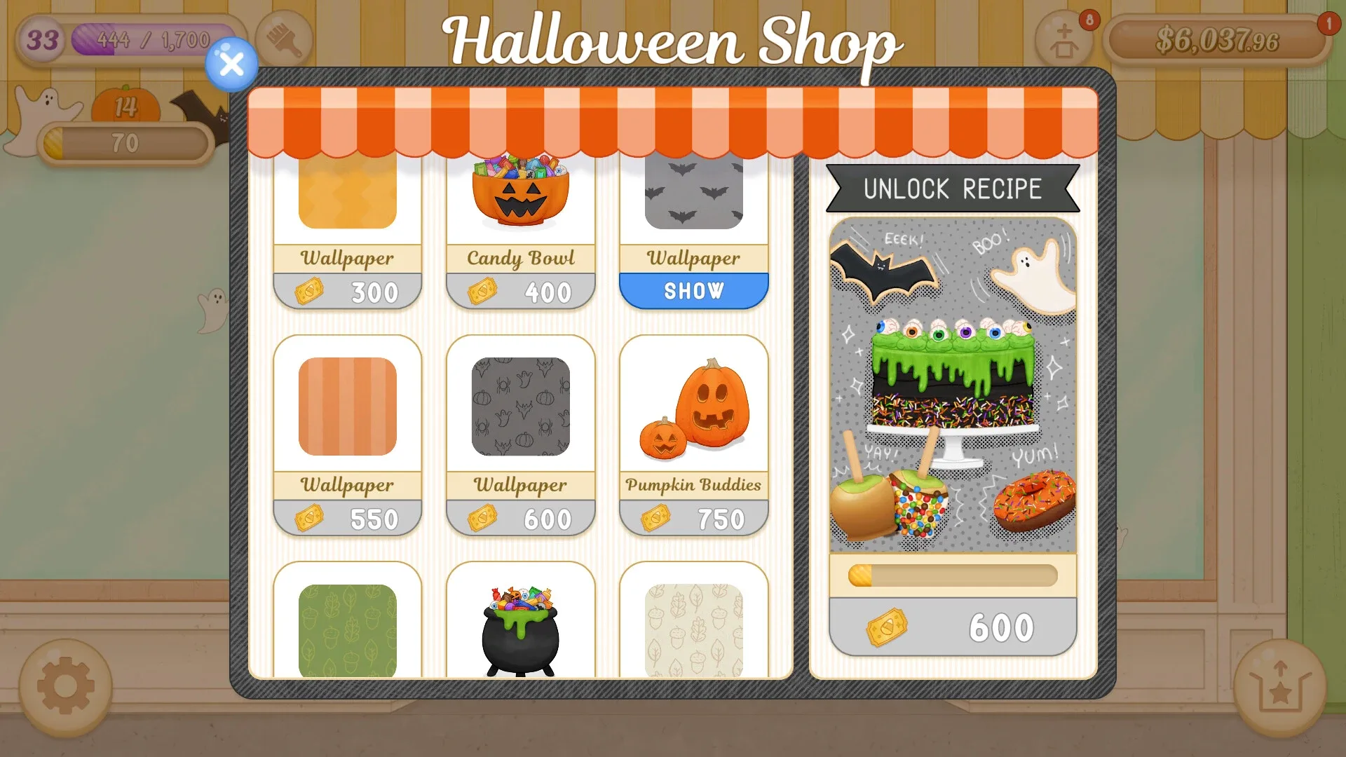 Invoke the Halloween spirit and invite autumn into your bakery. Bake spooky recipes, decorate your bakery for the season, hand out candy to your customers and spend tickets in the Halloween shop!