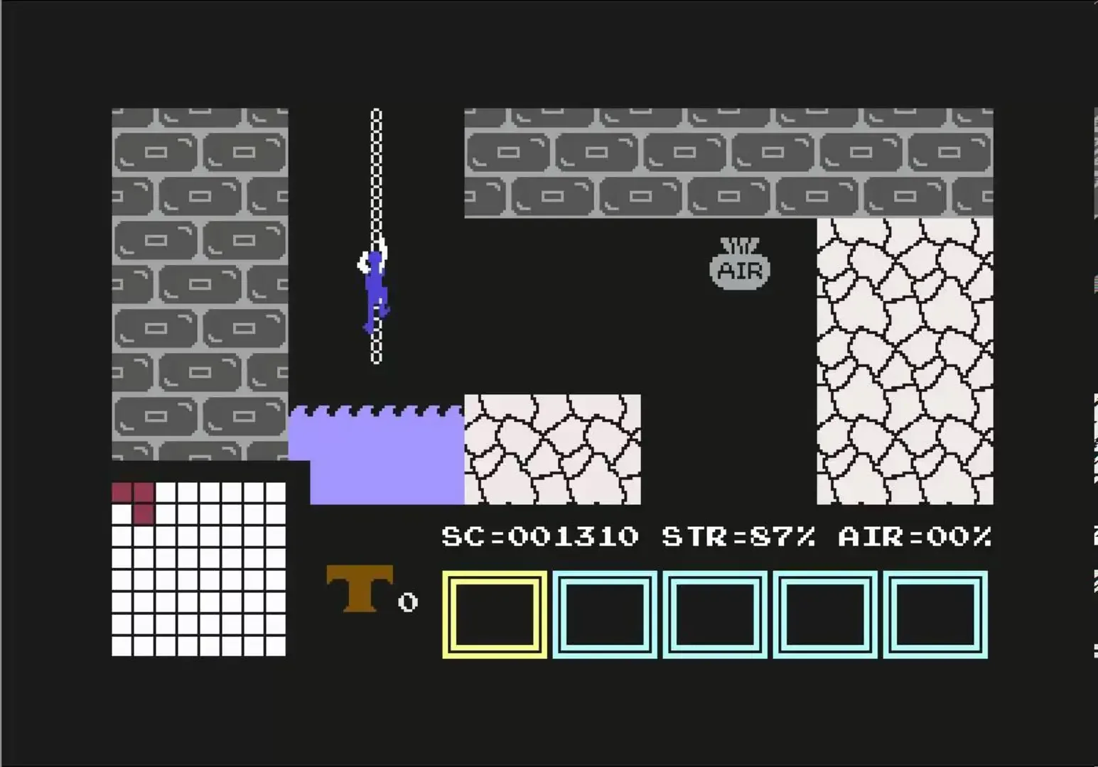 Hero of the Golden Talisman is an action-adventure game where players embark on a quest to save their town from an evil wizard's curse. The hero must navigate a vast, side-scrolling labyrinth spanning 64 rooms across five levels, totaling 512 screens of exploration. The objective is to recover five pieces of the stolen Golden Talisman while battling a diverse array of monsters. Gameplay combines platforming elements with combat, featuring abilities such as jumping, climbing, swimming, and shooting. Players can collect and utilize various objects and power-ups, managing a five-item inventory system. The game incorporates resource management for health and air supply, with an on-screen map aiding navigation through the complex maze. With its mix of exploration, combat, and puzzle-solving, Hero of the Golden Talisman offers a challenging adventure to restore peace to the cursed town.