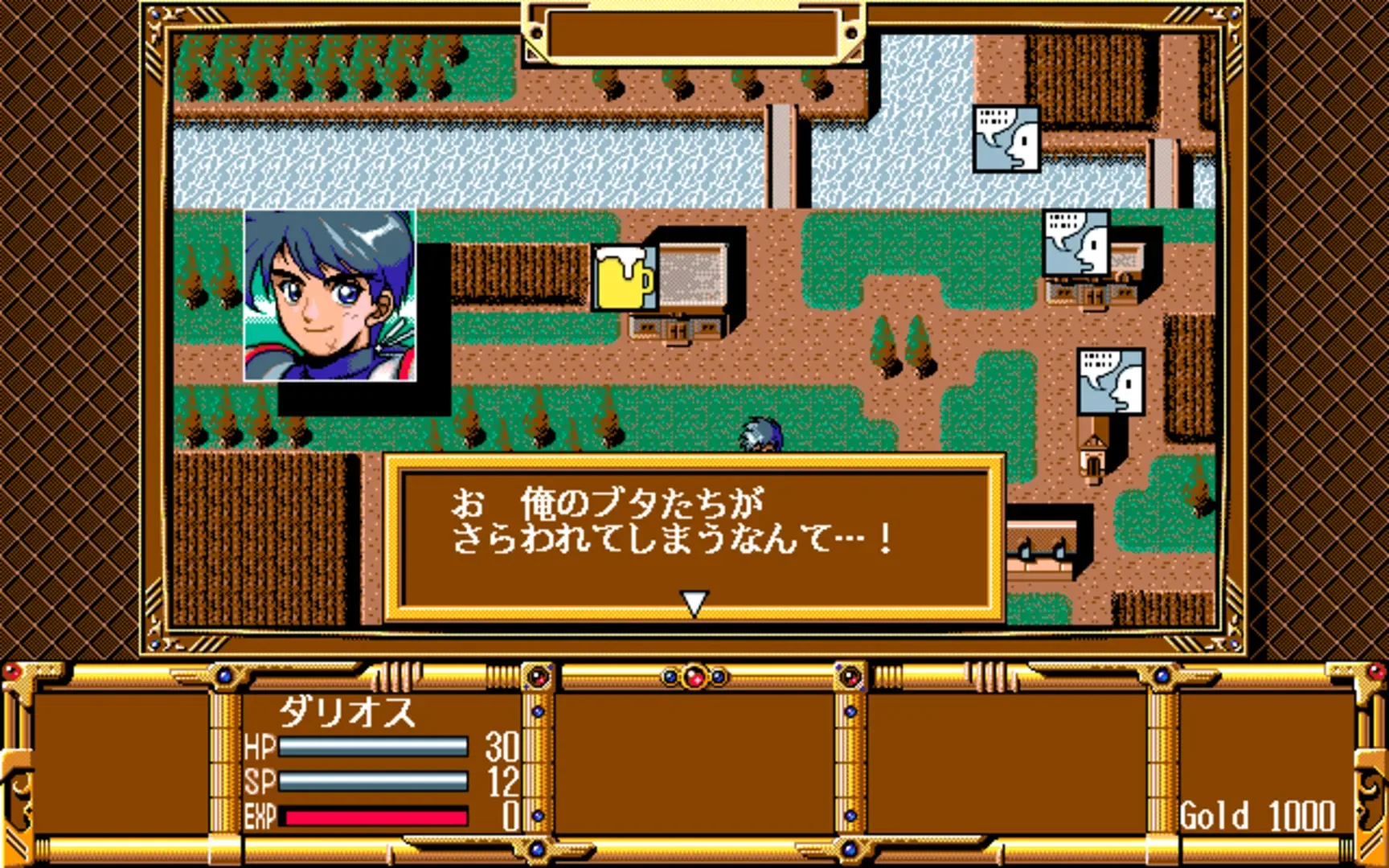 Gensei Fūkyō Den is a Japanese RPG with a somewhat "light" approach, both in story-telling and gameplay. The gameplay mostly follows the standard procedure of Japanese-style RPGs, although some features are simplified: there is no "world map", and town navigation is menu-based. Most of the gameplay consists of navigating maze-like top-down dungeons, fighting random enemies in turn-based first-person perspective combat. Characters use special points (SP) for powerful attacks and magic points (MP) for spells. Released through Disc Station Vol. 4 in 1994 for PC-9801.