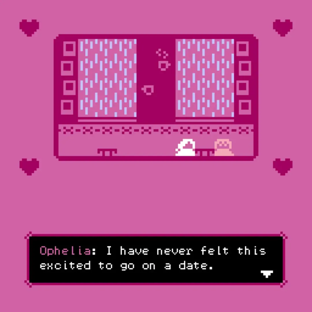This tiny bitsy game / visual novel tells the story of Lydia and Ophelia - two lesbians that experience their first date in person, after they have been talking online for a while. The scene takes place in a tiny café, on a rainy day.
