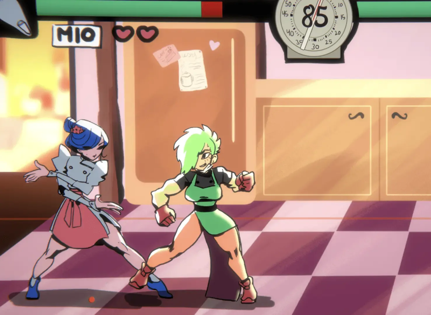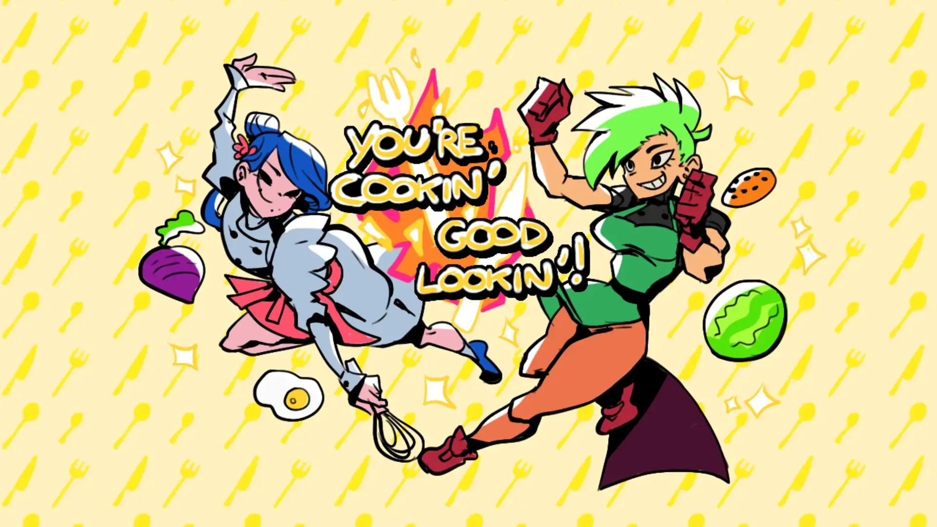 You're Cookin', Good Lookin' is a 2D fighting game! This game was created for Yuri Jam 2022. Mio and Beatriz are a married couple who, despite both being professionals in the cullinary industry, are fighting to decide who's cooking dinner tonight!