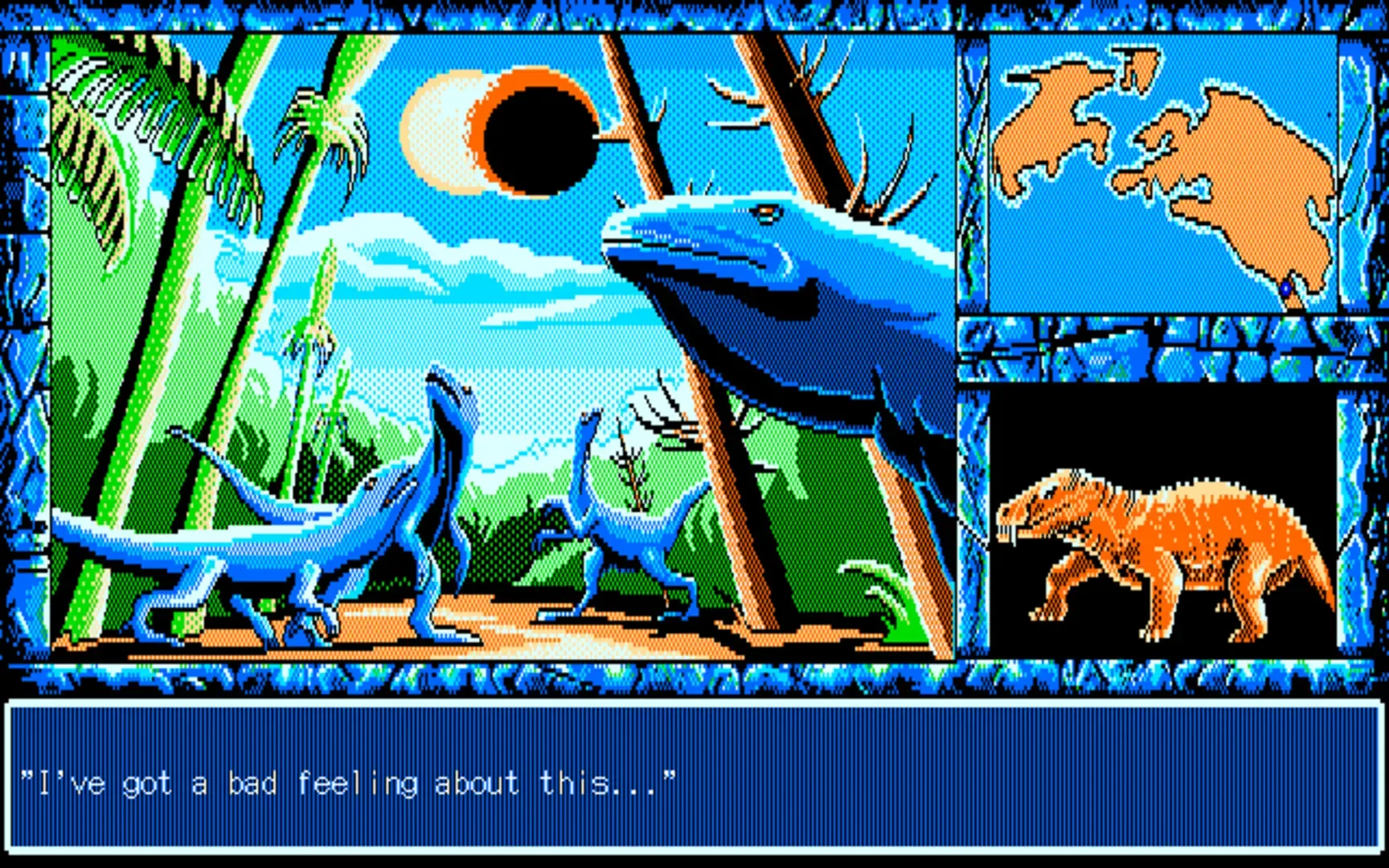 46 Okunen Monogatari: The Shinka Ron (fan translated as E.V.O.: The Theory of Evolution) is an RPG, about one step more primitive than the Dragon Quest games published by the same company. You control one character as they progress through the different eras of life on planet Earth, fighting turn-based battles with damage being based on stats that you control directly. Once you’ve pushed a stat to its uppermost limit, your character evolves into a completely different creature with different abilities in battle. The story itself is somewhat similar to Search for Eden, but much more fleshed out with a lot of different stories for each era that the game explores. And while Search for Eden ends with humanity as the pinnacle of evolution, The Theory of Evolution goes a bit further into the future…