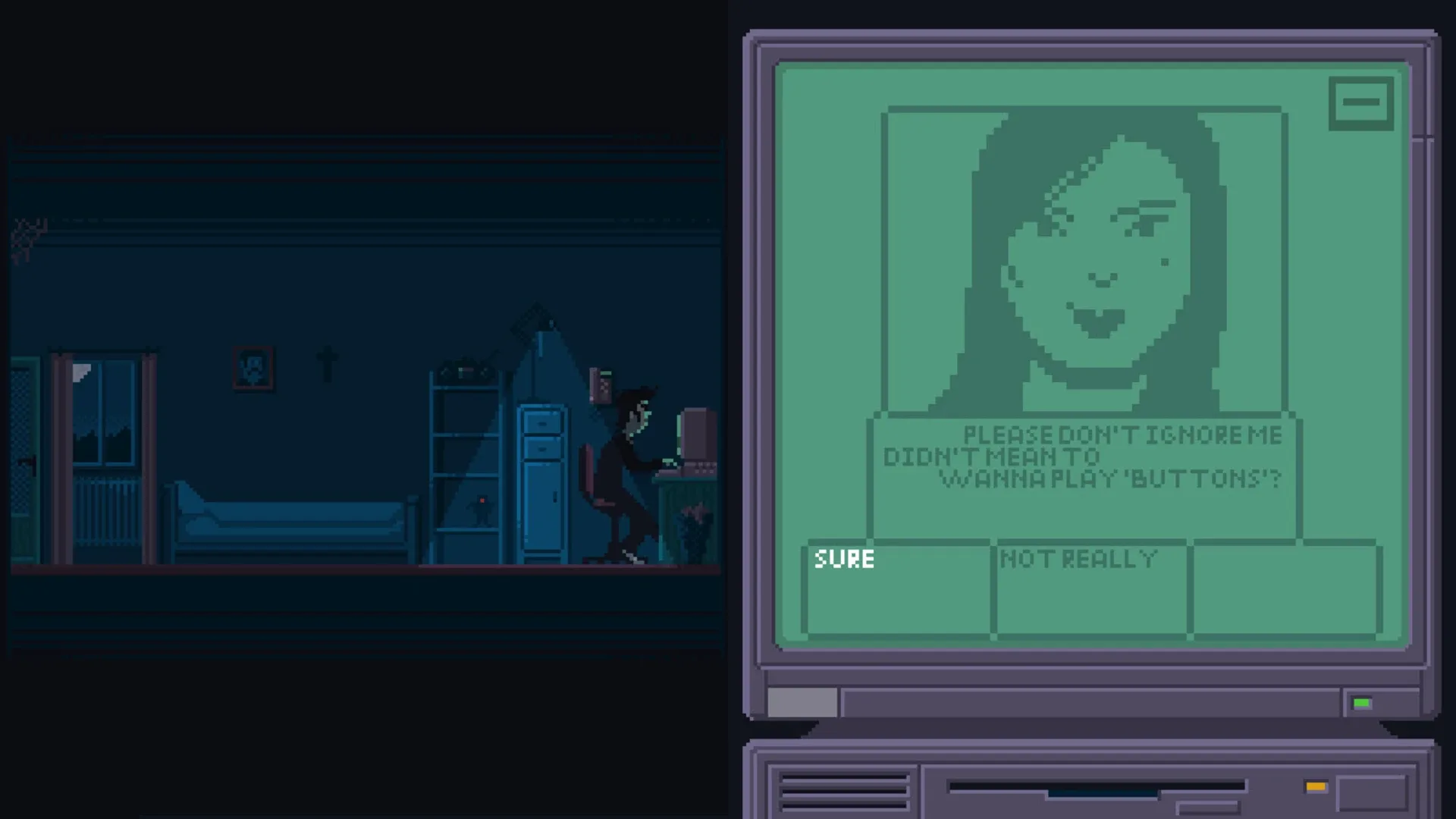 Don't Chat With Strangers is an experience puzzle game, mostly taking place in a single room. The main character in the middle of the night is approached by a strange girl in an online chat. Don't die and solve the mystery of the girl.