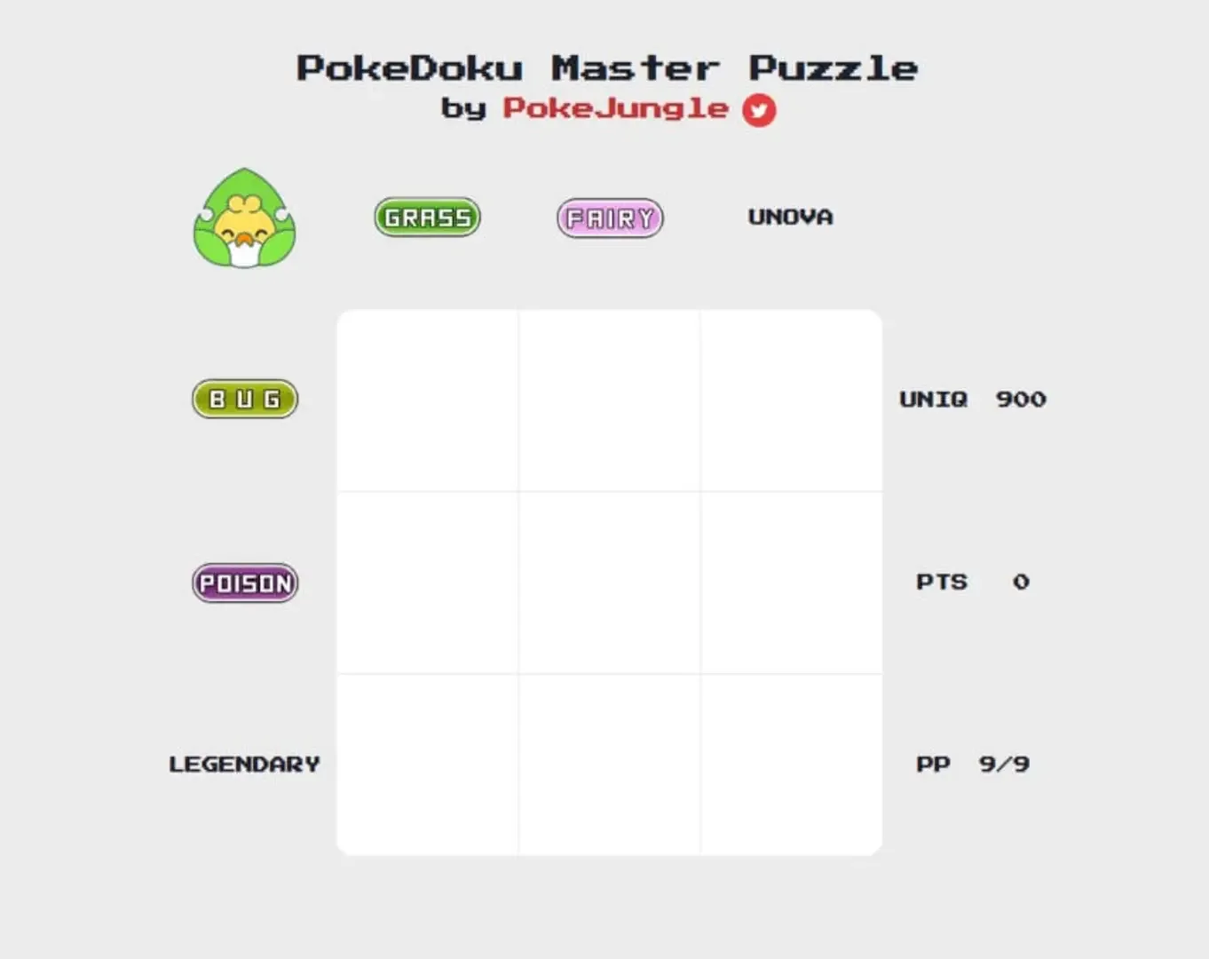 Pokedoku is a daily guessing game where players must input a set of 9 unique Pokémon which agree with a given set of characteristics for each row and column in a 3x3 grid.