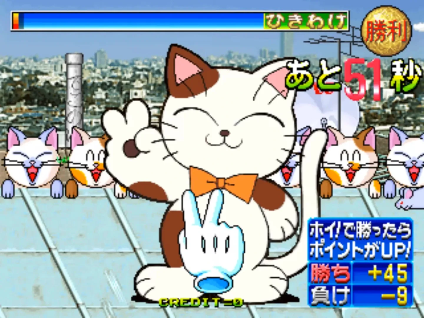 A Janken (rock-paper-scissors) simulator based off the Acchi Muite Hoi! variation of the game, where the player must win a Janken match then correctly guess which direction their opponent will look. The game's cabinet utilizes a unique control setup, with a large joystick with two buttons on it; holding both buttons chooses rock, a single button chooses scissors, and no buttons held chooses paper. The player can pick between four different opponents, with a meter at the top of the screen filling up whenever the player guesses the opponents moves right. Once the meter is full the opponent is defeated and the next in line challenges the player.