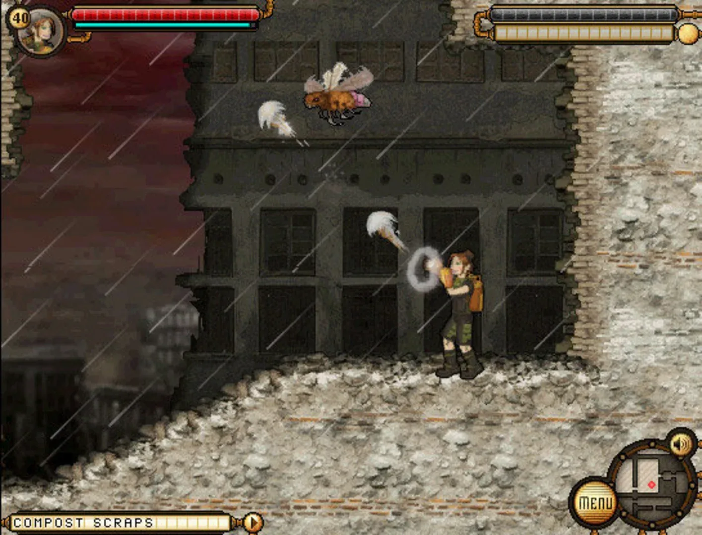 Remnants of Skystone was a 2D side-scrolling platformer in a steampunk post-apocalyptic setting with multiplayer elements. Players could play as one of the three playable classes (Aeronaut, Crag or Ferric), each with different abilities, and travel to different parts of Nidaria or Etherea. Missions and Quests were the main single-player elements and Trailblazing was the main multiplayer element.