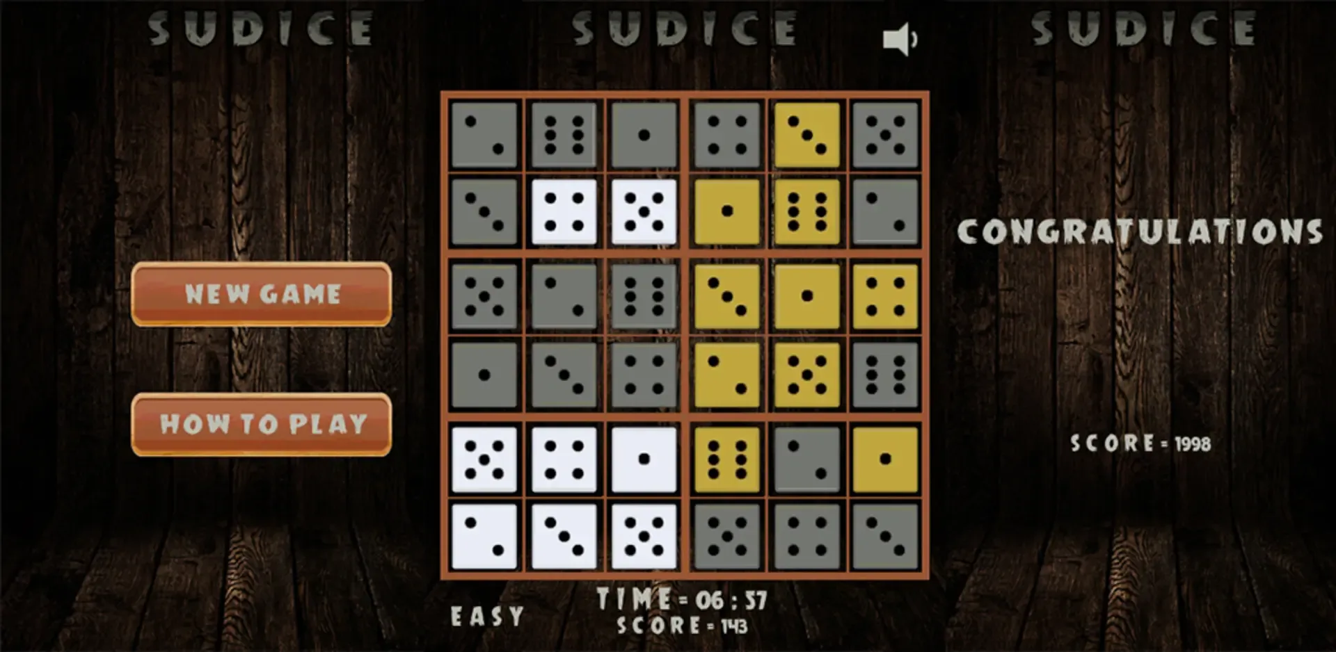 Choose your level. Choose your time limit. Swipe dices to roll them. Double tap to lock dice if you are sure. Solve the SUDICE and try to get the best score !