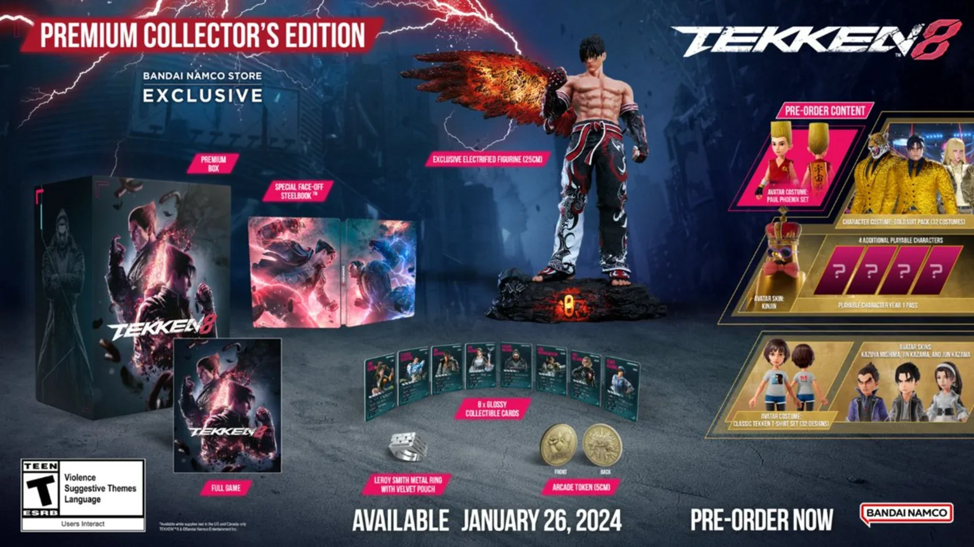 The Premium Collector's Edition Includes: • TEKKEN 8 • Playable Character Year 1 Pass • Character Costume: Gold Suit Pack • Avatar Costume (x32) • Avatar-Skins (x3) • Burning chain metal plate • Corporation stickers • Premium Box • Special Face-Off Steelbook • Glossy Collectible Cards (x8) • Leroy Smith Metal Ring with Velvet Pouch • Arcade Token • Exclusive Jin Electrified Figurine (25cm)