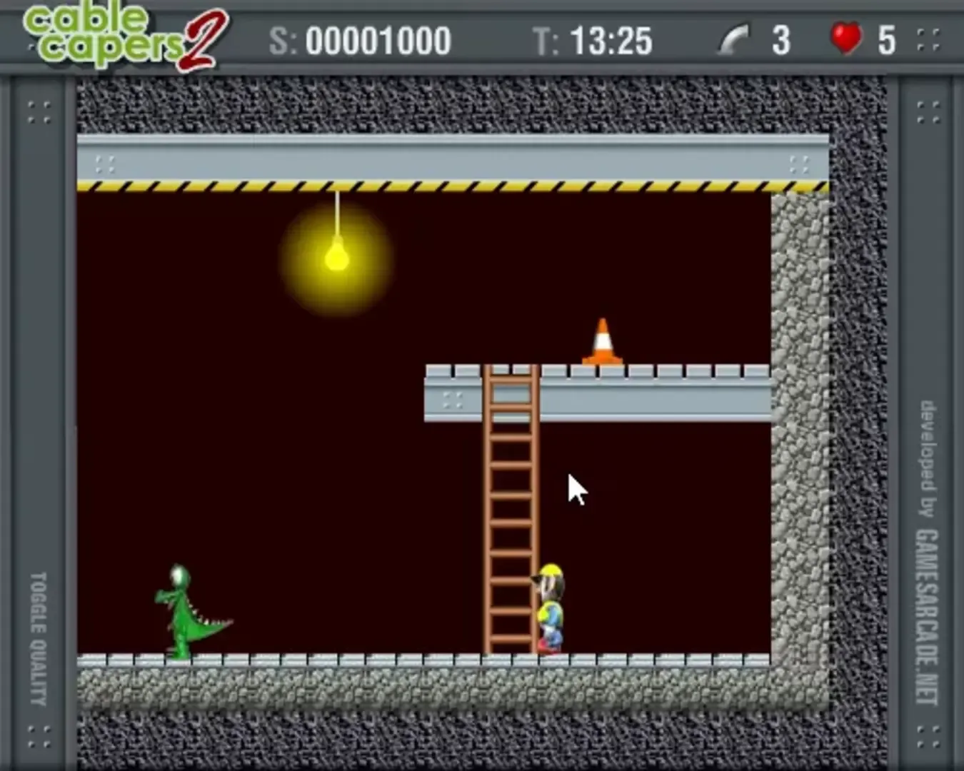 Cable Capers 2 is a platform game where the player helps a hero named Arnold to escape from the underground. He needs to avoid enemies and lasers.