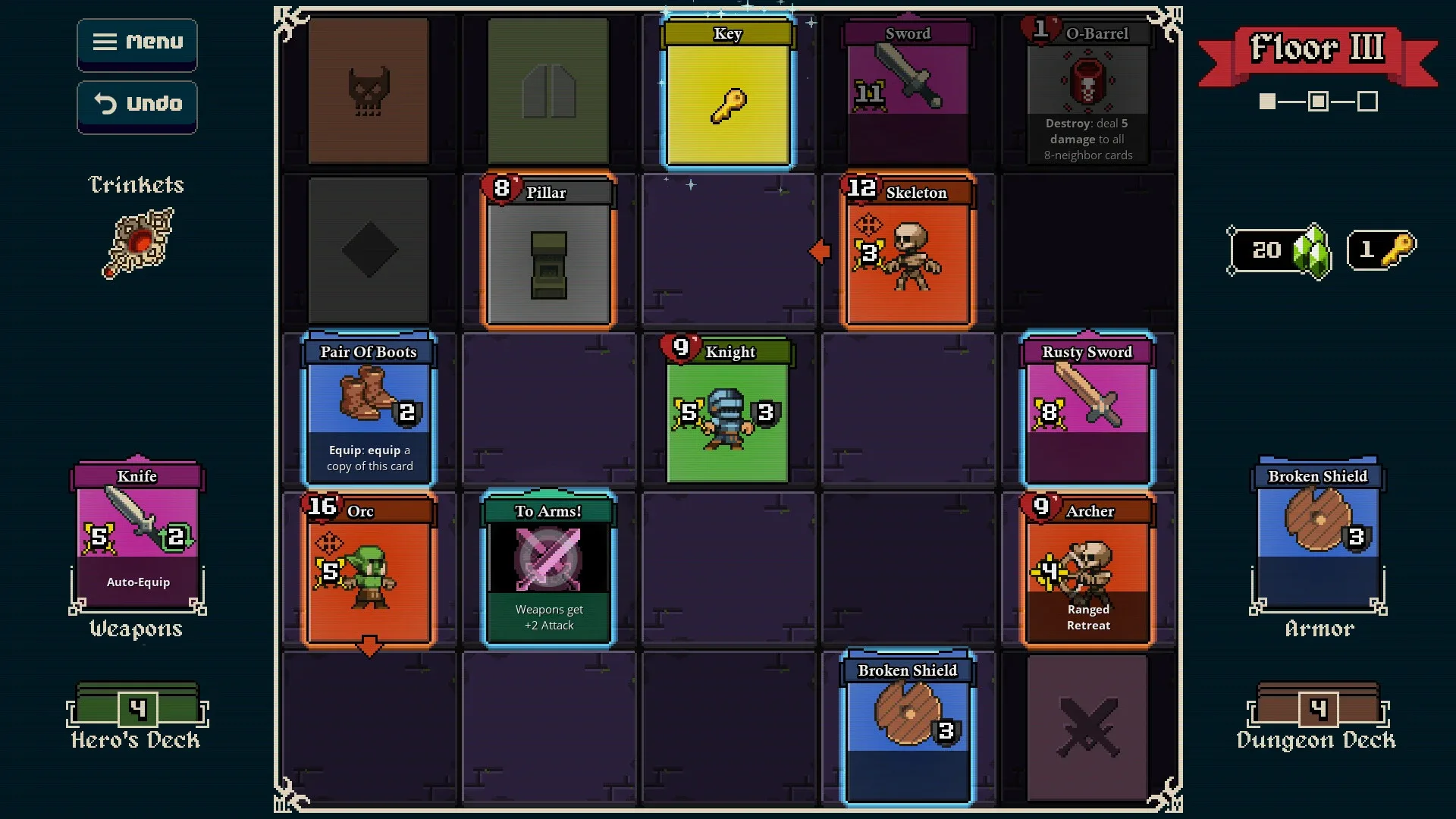 Lost For Swords is a Roguelike Deckbuilder, where the cards in your deck shape the rooms you’re exploring. Make your way up the tower, equip weapons and armor, cast spells and scrolls, activate auras, collect loot and defeat monsters in tactical turn-based combat.