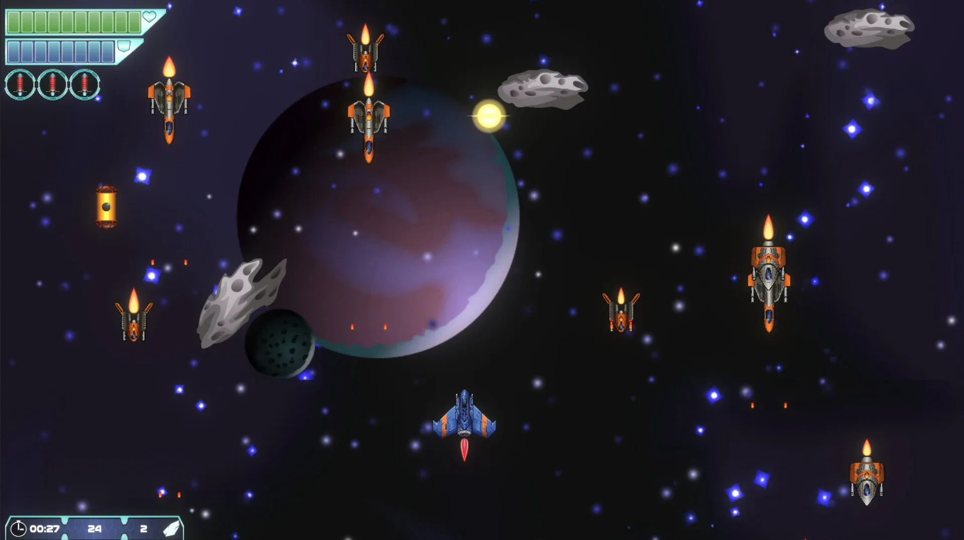 Embark on a perilous journey as Max, the space ranger, to hunt down the leaders of the Black Alliance. Pilot different spacecraft, dodge asteroids, battle enemies, and confront ruthless leaders. Become a true hero of space!