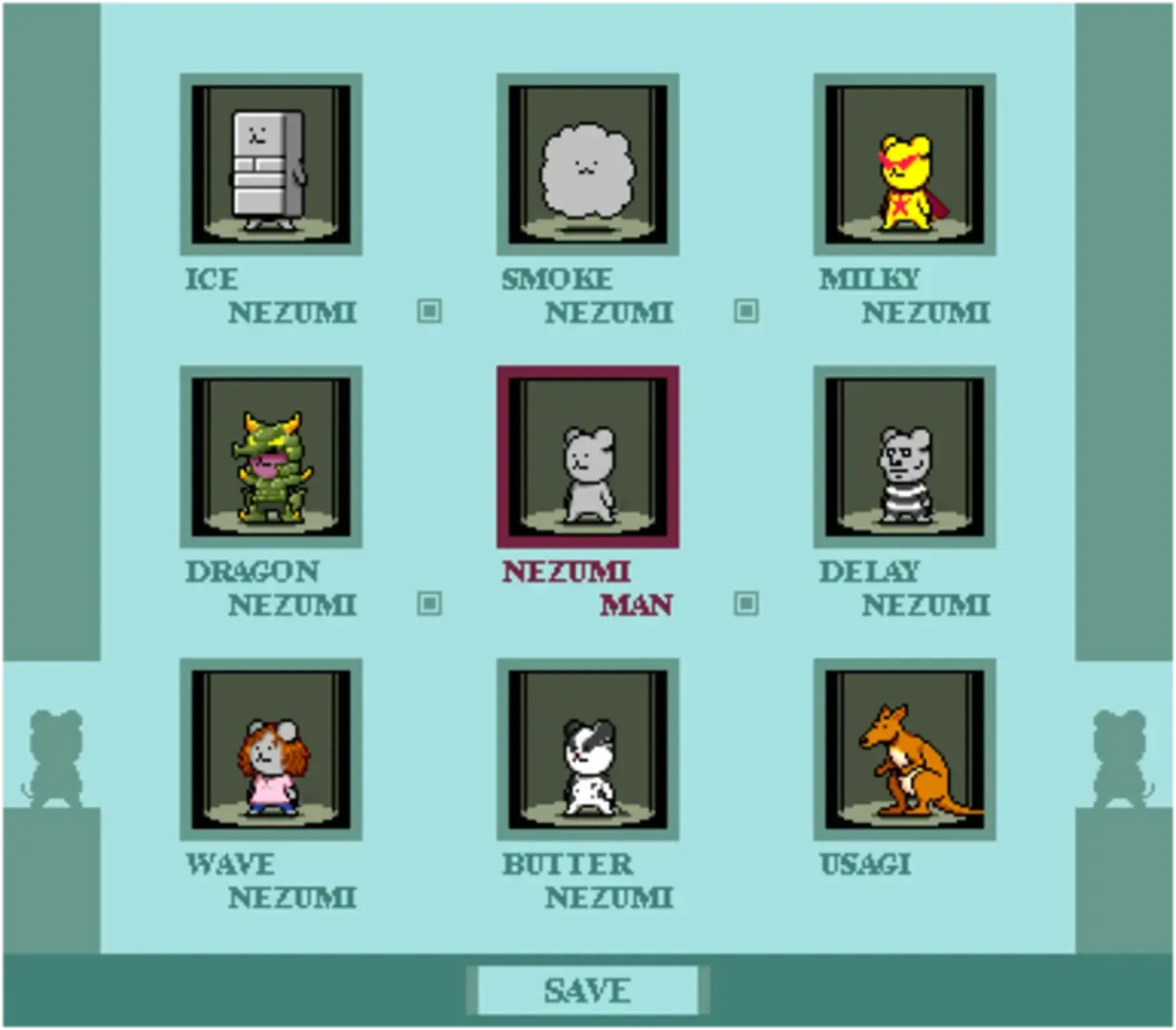 Nezumi Man is a homage to/parody of the classic NES Mega Man games, starring a rat who can run, slide, jump and shoot like the Blue Bomber himself. His goal is to stop the plans of Dr. Gyoniku and his henchmen, along with seven other rat and ratlike characters. The game was an entrant in the 2009 HSP Program Contest. It is notable for its humorous characters and situations.