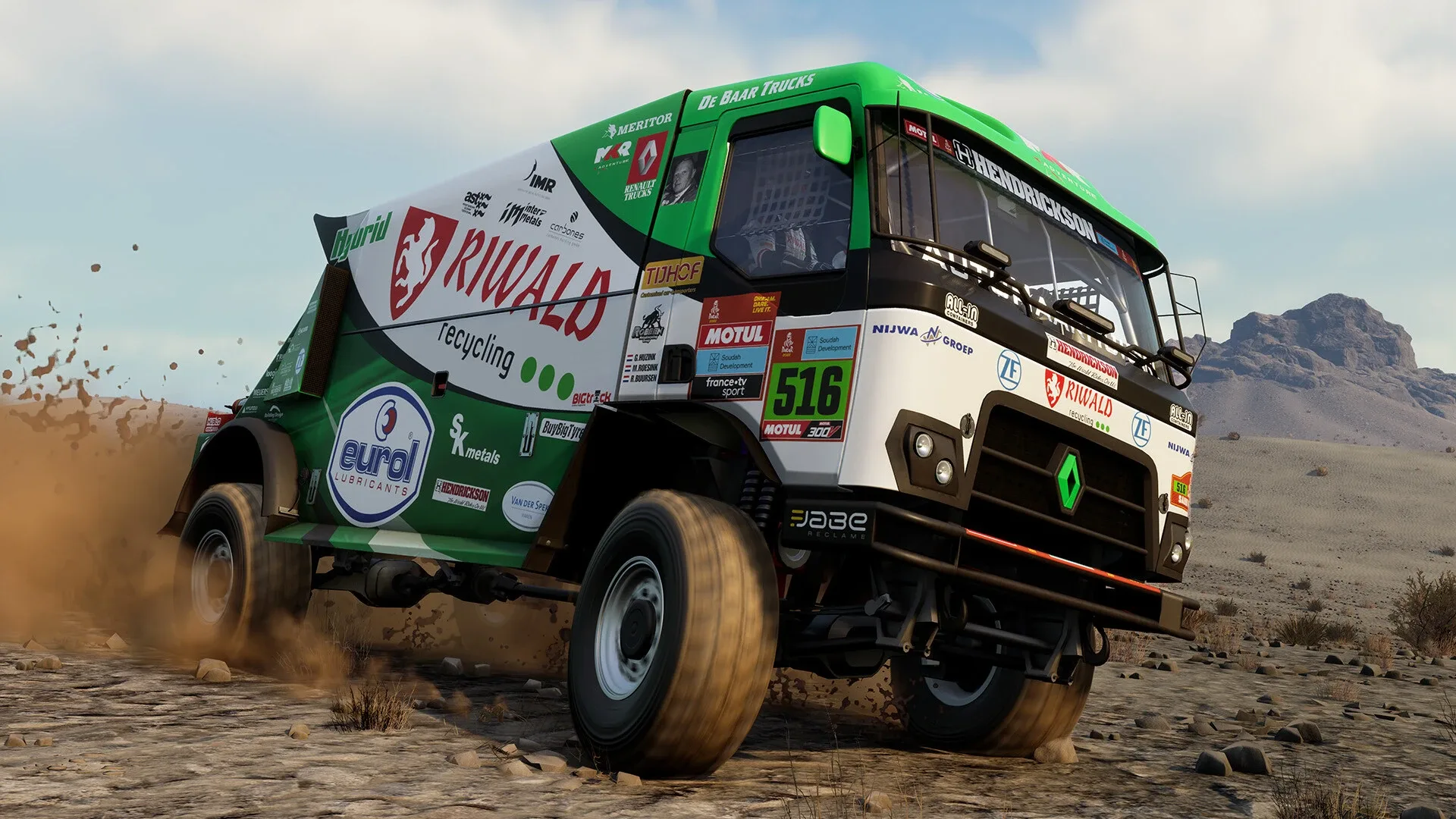 Race across the desert with these future-facing Hybrid Vehicles. Featuring the GCK Motorsport, the Hino 600 Hybrid, and the Riwald Renault C460.