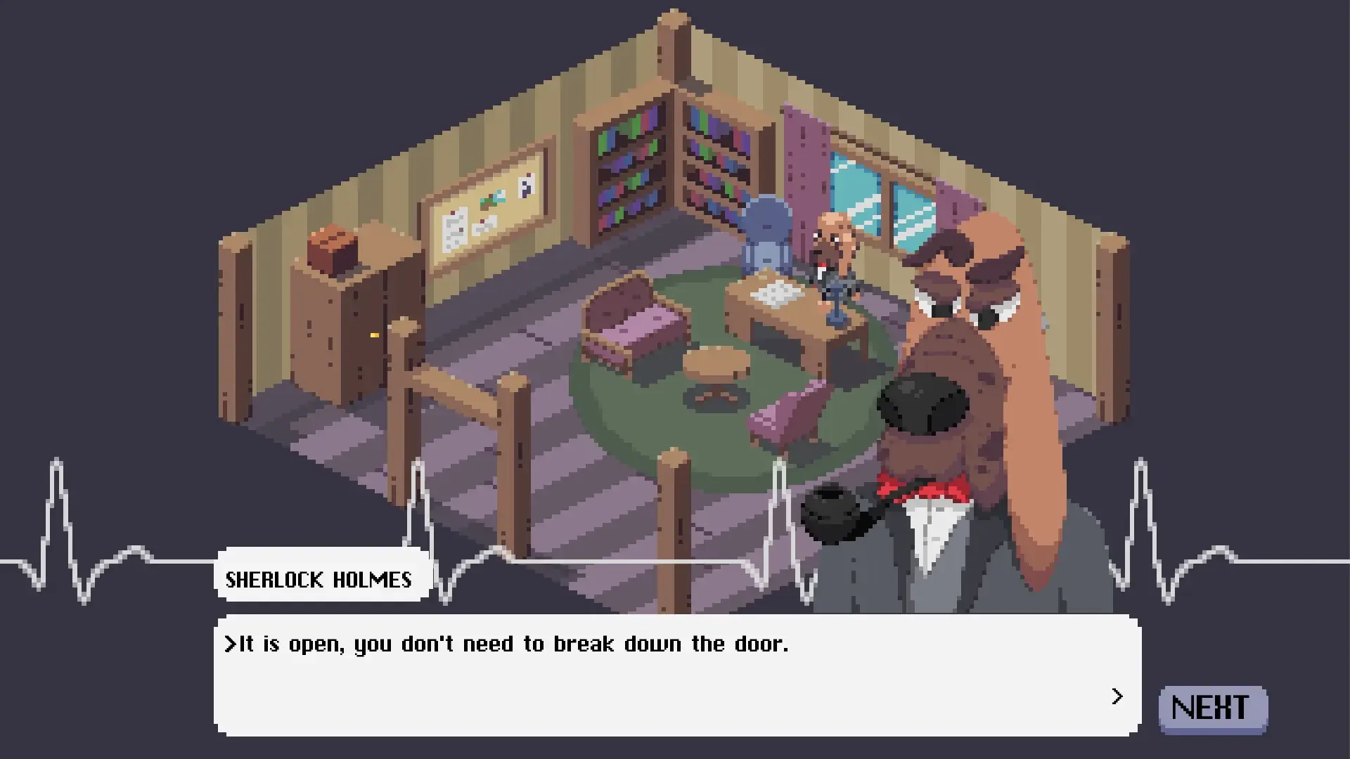 Play as a retired Sherlock Holmes in this text-based murder mystery, where your only eyes on the scene are those of the same person threatening to kill you. When Sherlock thought his detective life was long over, he finds himself in a new case: solve the murder of the great philanthropist, Mr. Banks, from his office in Baker Street, or die trying. Be an armchair detective and navigate through dialogue options in order to find the truth. But be careful about how much you press your client and how you word your accusations, or you might not see the next day. When the client is nervous, your hound instincts will kick in. Will you press forward and try to get the truth, or will you direct the conversation in more subtle ways? Discover who, how, and why, and give the right answers when the time comes.
