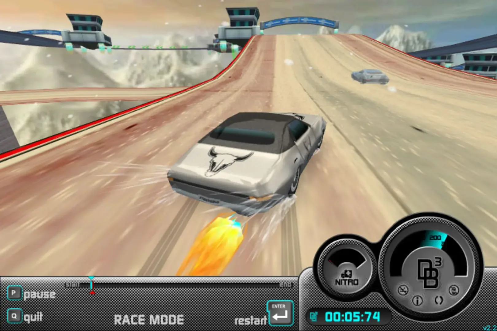 Citizens of the future: start your engines and scream down tracks suspended high above earth's toxic ground. Choose your course, choose your car, and race towards victory with your head in the clouds. Hit your brakes on the corners to drift and earn nitro boosts, then burn by your opponents to collect the car of the day!