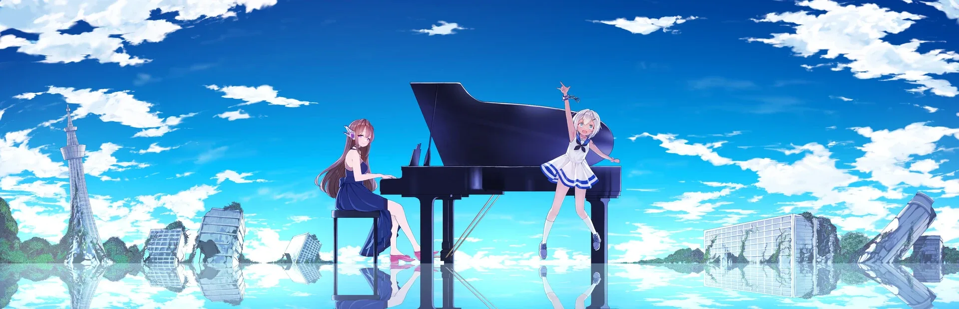 Half a century has passed since wars broke out over land due to rising sea levels. Two shadows walk through the submerged ruins, moving from house to house in order to survive. Along the way, they arrive at a concert facility. There was a woman with long chestnut hair playing the piano.