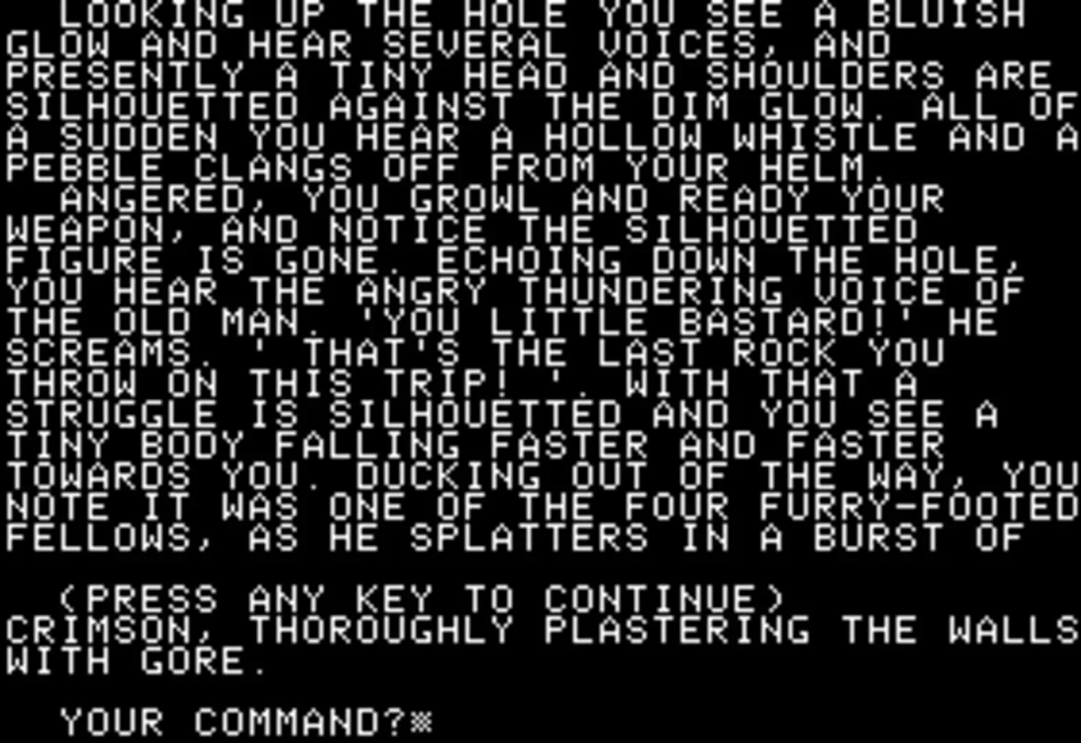Eamon, sometimes known by the longer title The Wonderful World of Eamon, is a role-playing adventure game created by Donald Brown and released for the Apple II in 1980. The game is a text adventure similar to other early titles like Adventure (1976) or Zork (1980) and to later text-based Multi-user dungeons (MUDs), though with many role-playing elements not available in other interactive fiction. Eamon software is non-commercial and is freely available in the public domain.