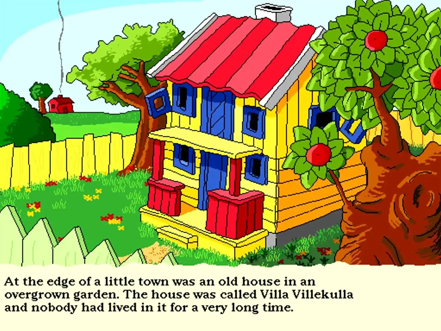 Pippi Longstocking is a well-known fictional character in northern Europa. She is a little girl that never grows up and lives with no adults in Villa Villekulla, an abandoned house, with a horse (with no name) and a monkey, Mr. Nilsson. She says her mother is in heaven and her father is king of a pacific island. But who really knows ? The original stories, written by Astrid Lindgren since 1945, were adapted into films and television series. Here, is a computerized version where children will discover her little world. First, they'll have to enter Villa Villekulla, by the door, of course. Players will explore the rooms in the Villa (hall, kitchen, bureau, bedroom, and attic) and solve different types of puzzles (i.e. jigsaw, memory). There's also a book activity where children can choose among three books and start these stories with screen texts that can be turned on or off. Texts are available in twelve (say, eleven because of British/American english) different languages.