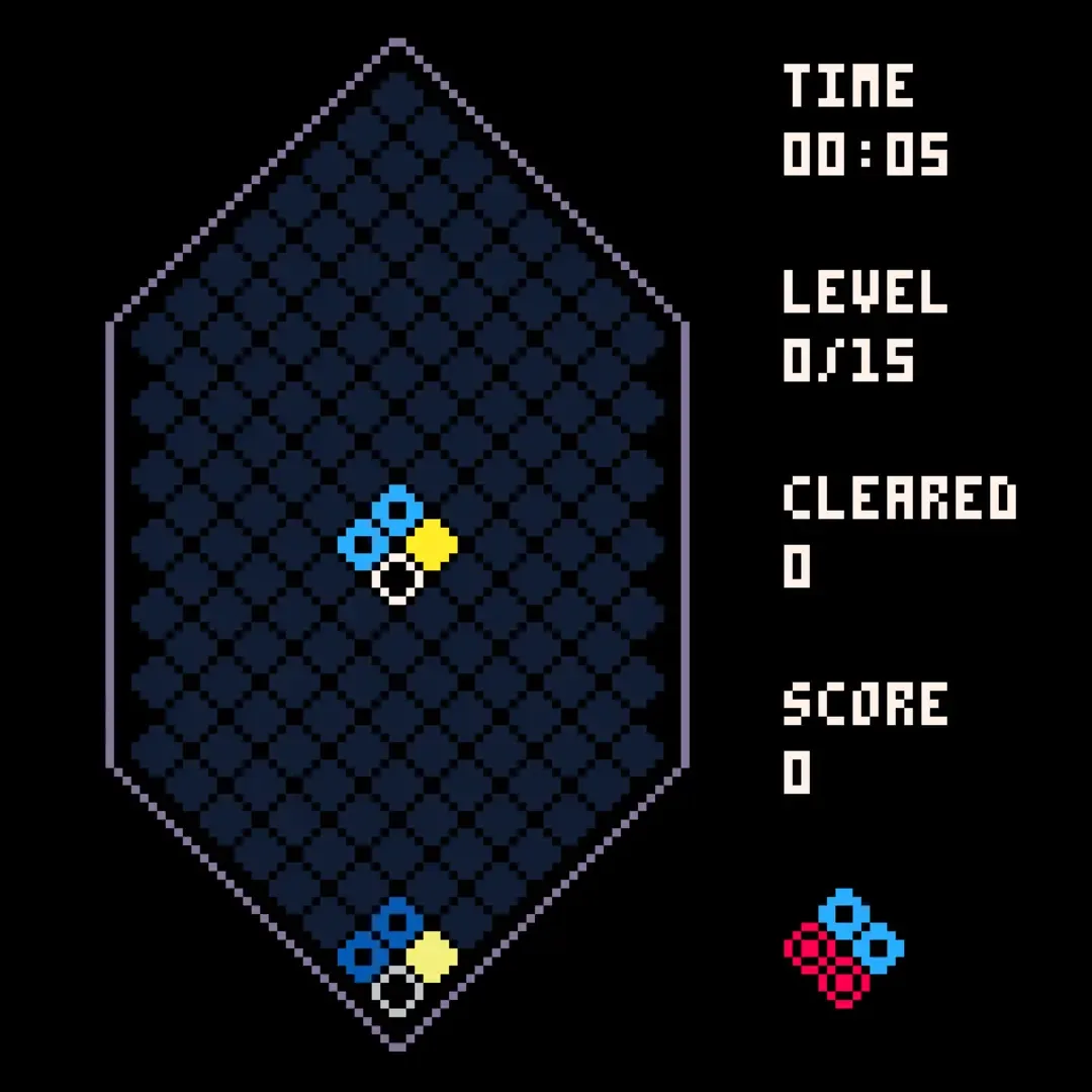 A demake of Mixolumia for the PICO-8. The goal is to reach level 15 by clearing 450 blocks. If the board fills up you lose.