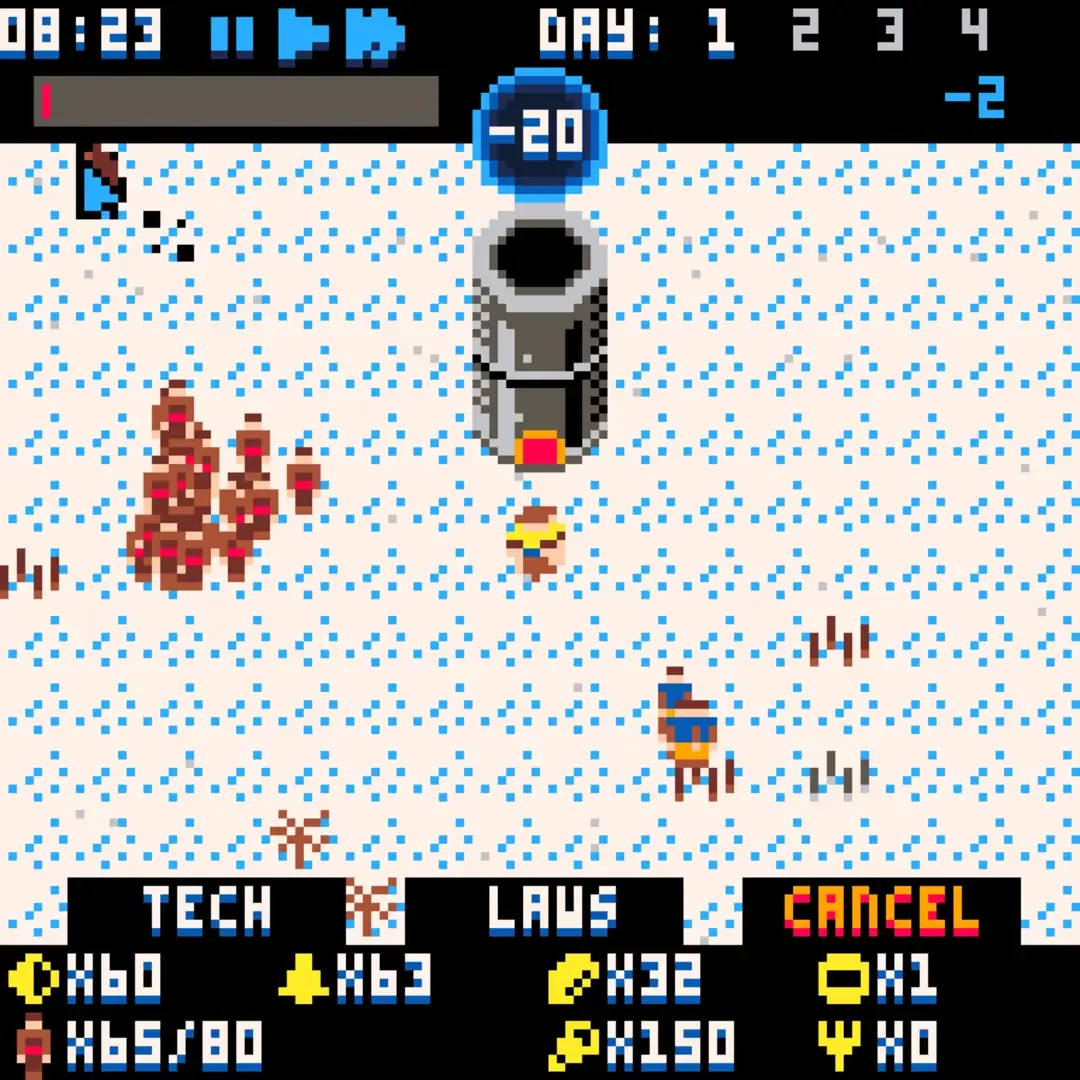 A demake of Frostpunk for PICO-8. Welcome to the frigid wastes of Northern England. The world is cooling, London is in disarray, and there is no end in sight. You are charged with helping your group of refugees survive the cold. This task will be daunting and dangerous, but you are not without hope.