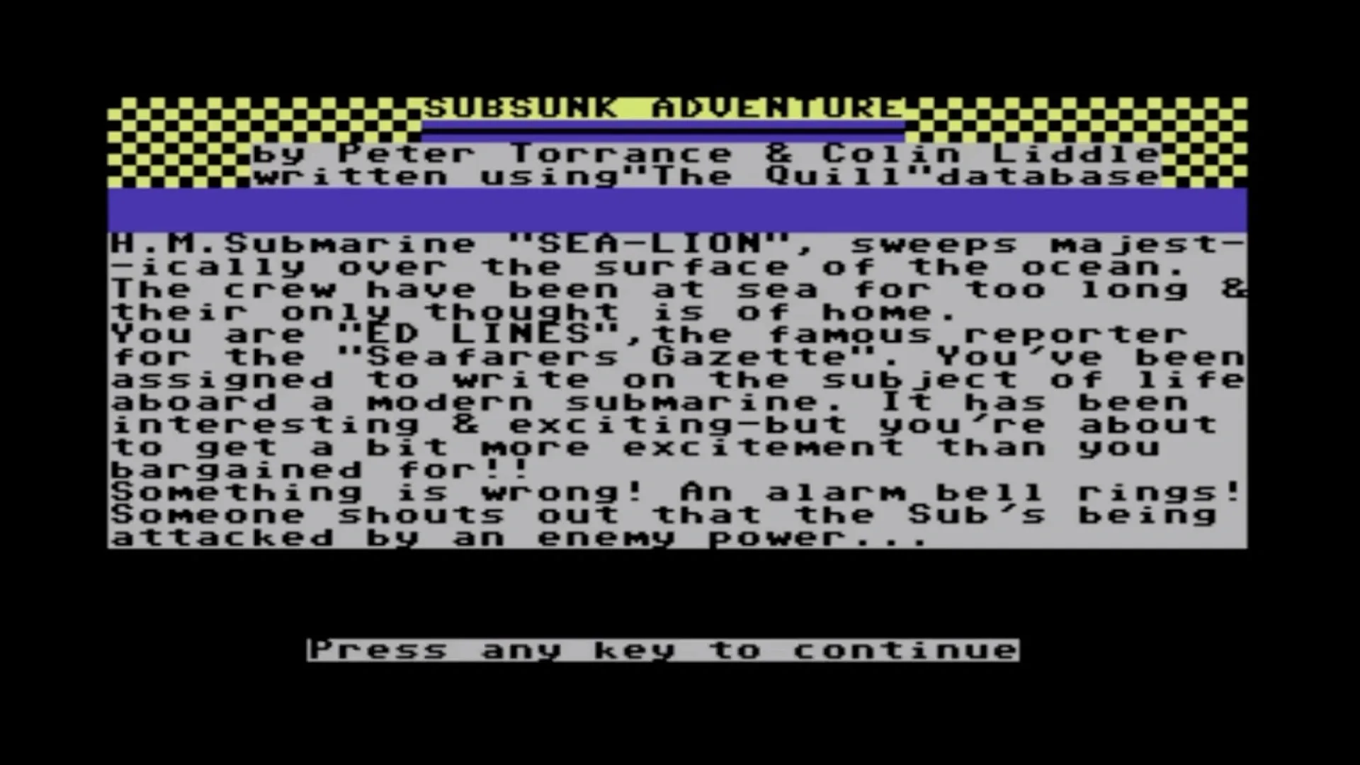 As reporter Ed Lines, you are on board HMS Sea Lion when it is attacked and sunk. Now you must send the Subsunk message..