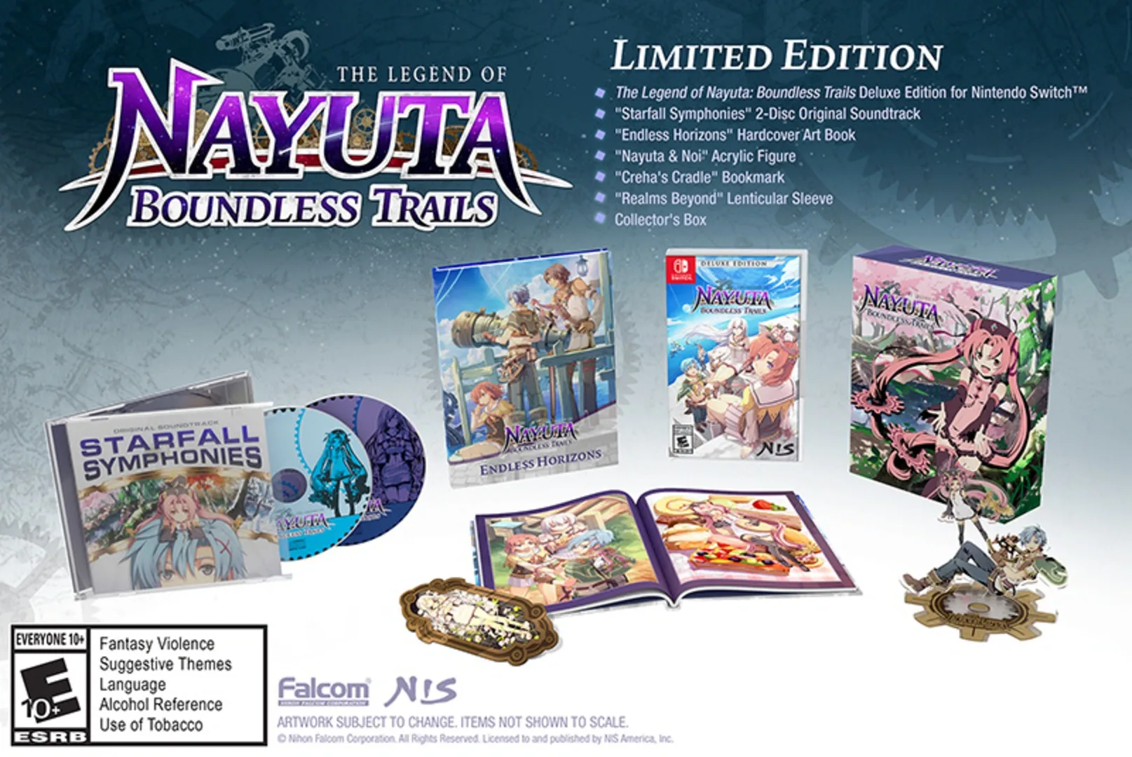 The Limited Edition includes: - The Deluxe Edition of the game - "Starfall Symphonies" 2-disc Original Soundtrack - "Endless Horizons" Hardcover Art Book - "Nayuta & Noi" Acrylic Figure - "Creha's Cradle" Bookmark - "Realms Beyond" Lenticular Sleeve & Collector's Box