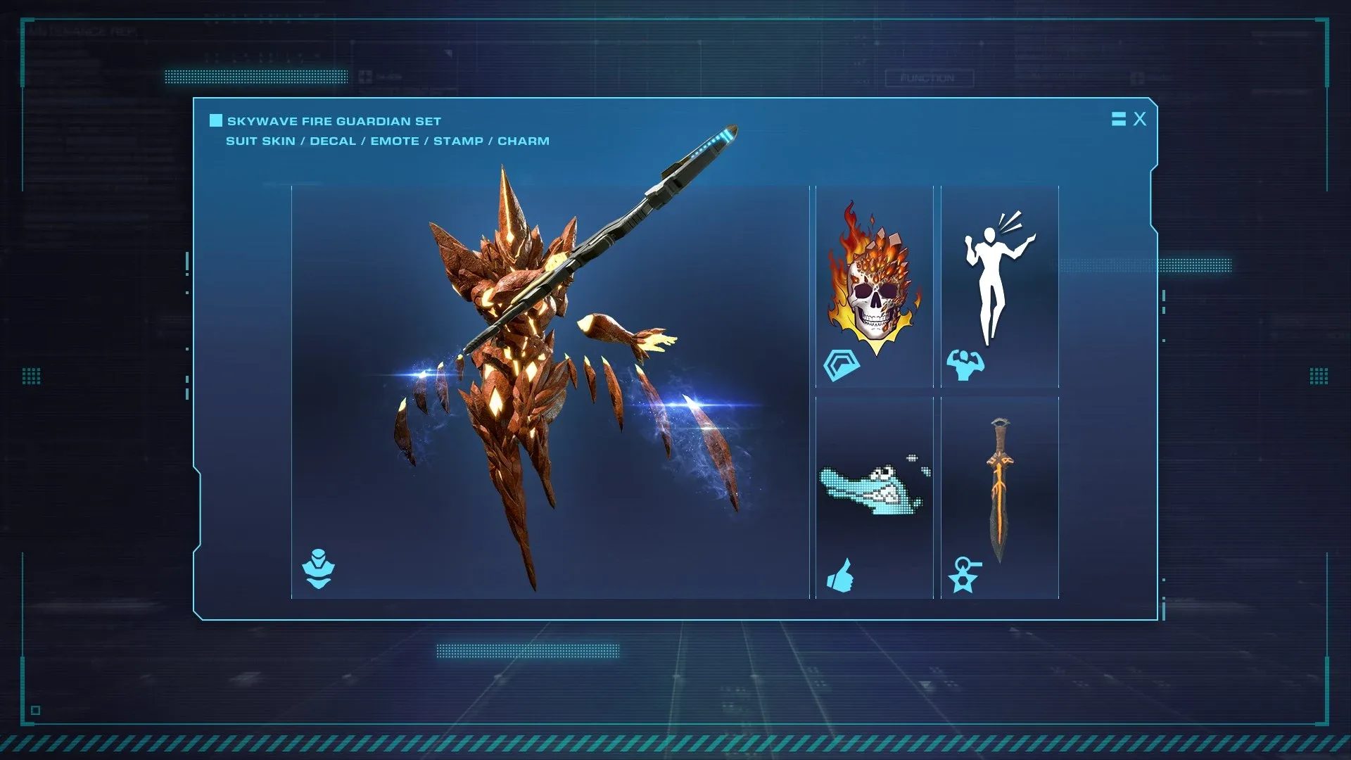 This pack contains five cosmetic items, including a skin for the Support suit Skywave. Fire Guardian, a golem wreathed in flames! Equip these cosmetic items as you fly around the battlefield and lead your team to victory!