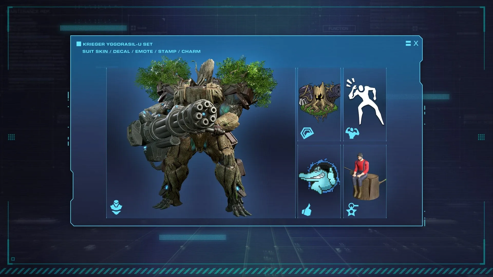 This pack contains five cosmetic items, including a skin for the Tank suit Krieger. Yggdrasil-U, recipient of the gifts of Mother Nature! Equip these cosmetic items and protect your team like a sturdy tree!