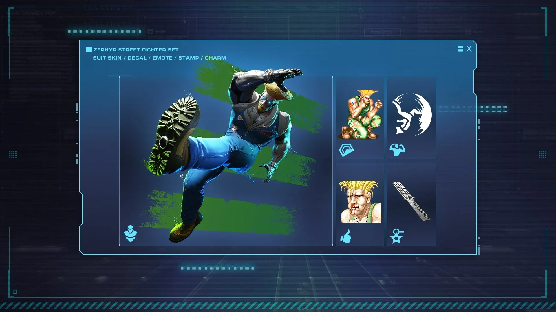 This pack contains five cosmetic items, including an exosuit skin that makes your exosuit take on the appearance of Guile, the U.S. Air Force soldier who fights for peace in his homeland. Equip this skin and slice through the air with a Somersault Kick!
