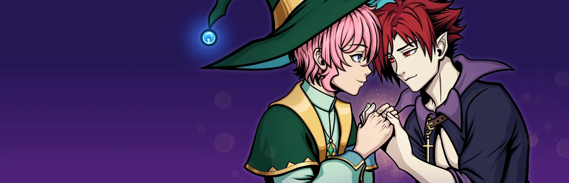 "Spellbound Hearts" is a visual novel where Lycos, a trapped vampire, meets Zephyros, a wizard seeking his blood to save a village. Together, they journey through trust, redemption, and love.