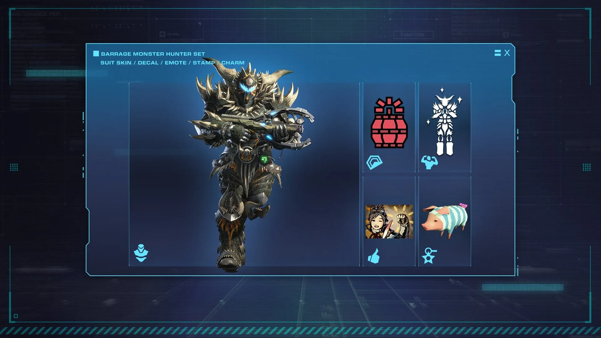 This pack contains five cosmetic items, including a suit skin based on an armour set made from parts of the terrifying Elder Dragon, Nergigante!