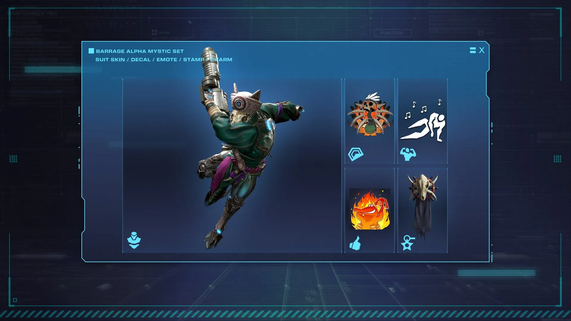 Includes 5 cosmetic items, including a suit skin for the assault "Barrage Alpha", which destroys enemies by bombing them with rocket launchers. Mystic, which wears an eerie atmosphere! Equipped with cosmetic items, blow away both enemies and evil spirits with a powerful blast!