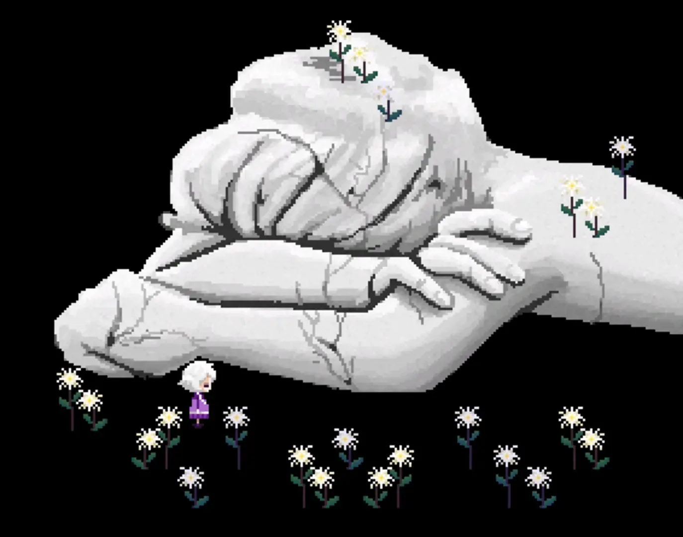 Daughter is a traditional Yume Nikki fangame starring Edel, an old lady who lives alone and refuses to enter the rooms of her home besides her own. You may explore her dreams while she waits for her family to visit her. As you explore her dreams, you can collect Edel's power fantasies (effects) which are "better" versions of her that will help you go deeper, and the deeper you go eventually you'll be able to open the doors and find what is Edel hiding.