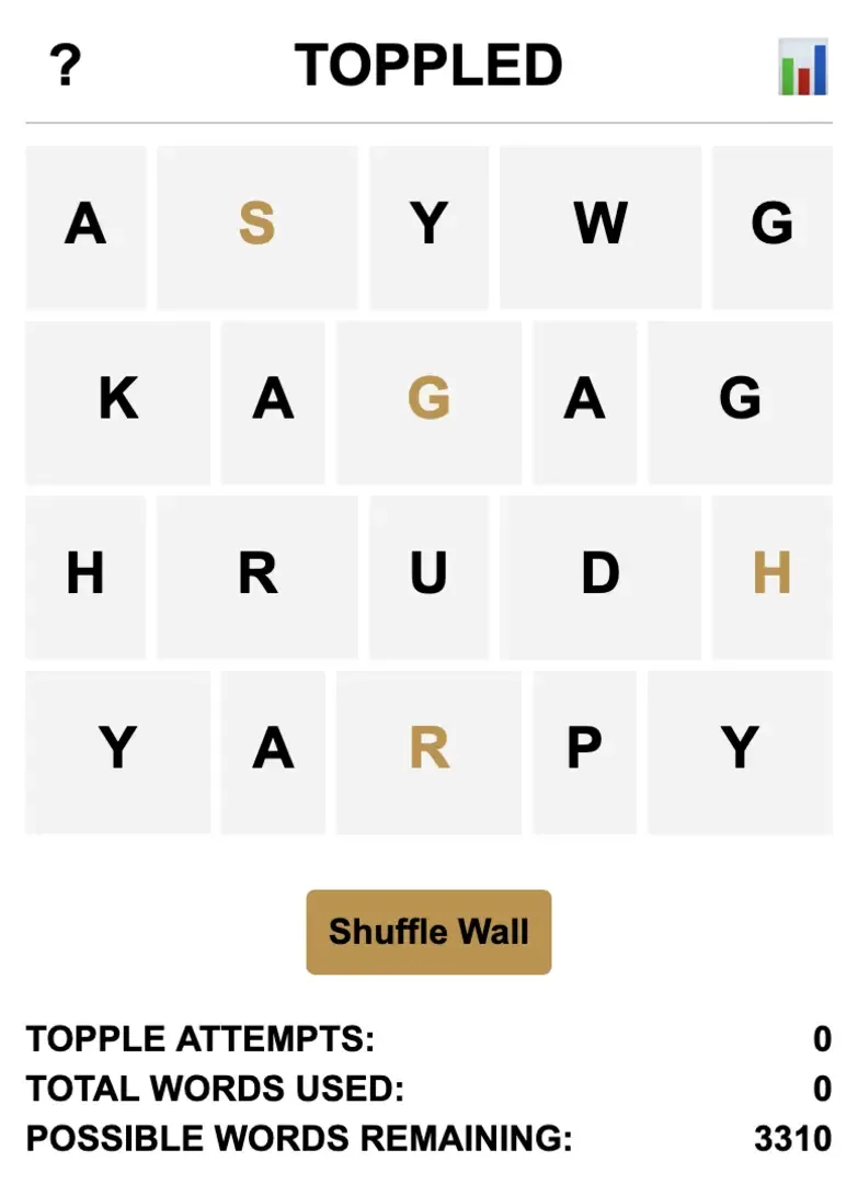 Toppled is a daily word game. Your challenge: to create four valid five-letter words and Topple the wall. Beware though! You may make 3 great words and be left with 5 letters that simply can't make a word. This would be a failed attempt at toppling the wall. Fewer attempts and words = a higher score! Every wall also contains four GOLDEN words (ooooh!) these are worth a whopping 100 points each. To help you find them, their starting letters are highlighted gold. The gamble you have to make is... do you try for the golden word bonus and increase your word count? Or just play it safe with some regular words? Everyone faces the same wall each day but there's no one solution to each wall. How you try and topple it is up to you!
