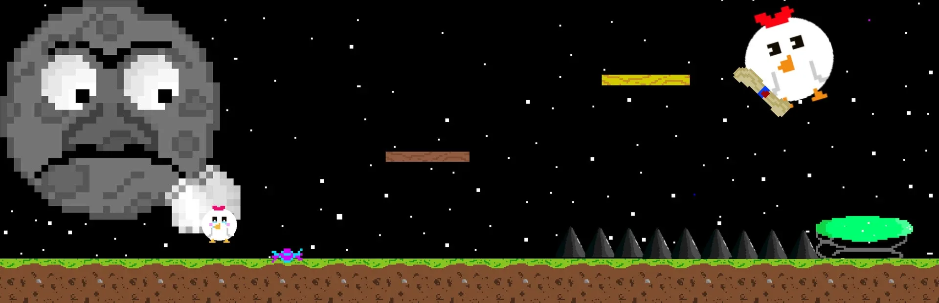 Platformer game Chicken Tale with a touching story and pixelart graphics three difficulty levels so that both beginners and experienced players can enjoy