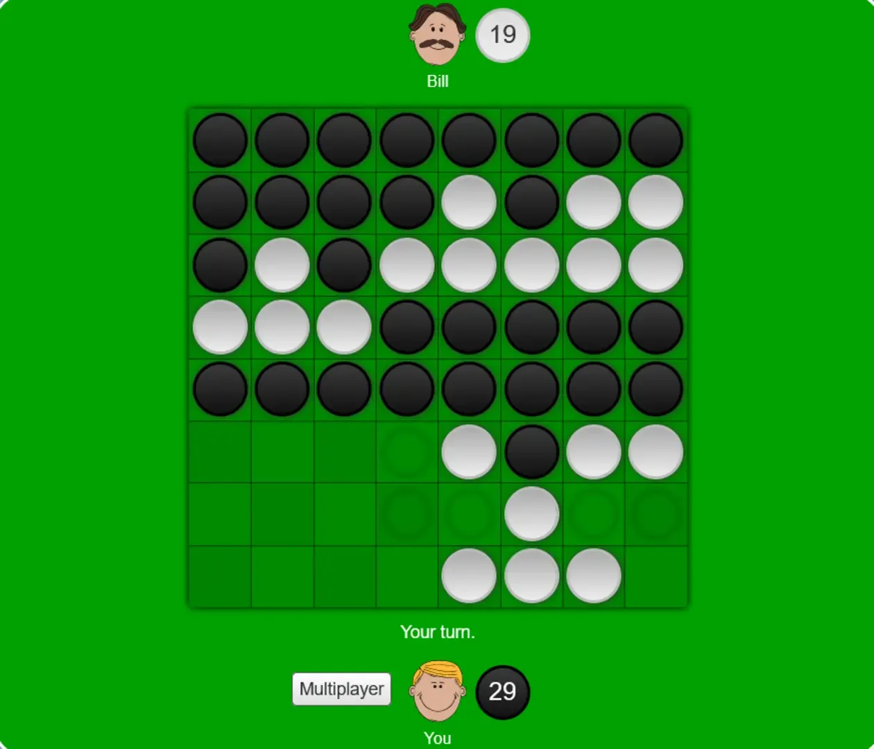 Take turns putting your pieces in the 8x8 square and get more of your pieces on the board than the opponent's pieces.