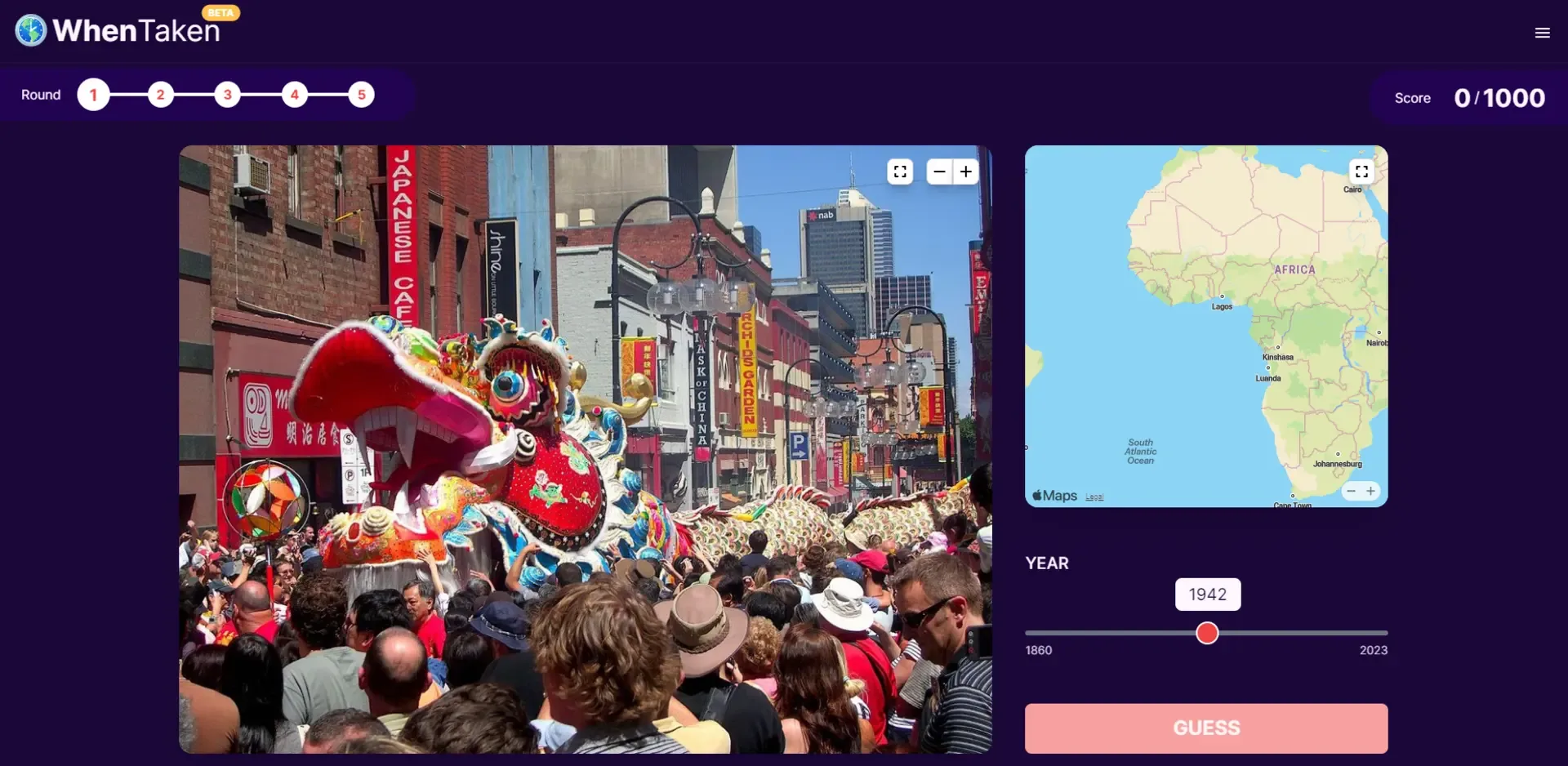 Look at the photo and try to guess the location and the year when it was taken. Place your pin on the map. Move the slider to select the year or simply type it in. When you’re ready, press the button to make your guess.