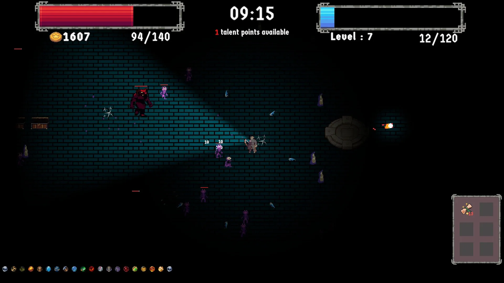 Fight your way through hordes of monsters in this highly customisable 2D survival roguelite. Explore, unearth and make the most out of the upgrades, talent trees and items available to push through the attack. What will you find in the dark floors of the wizard tower, and will you save the night ?