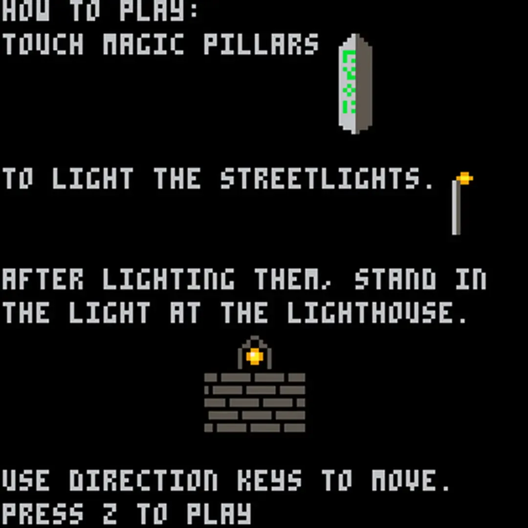 This is a short horror game that I developed for Fantasy Console Game Jam #3 using the Pico-8 fantasy console. This game is not suited for children or those who are easily disturbed. The objective of this game is to move around a desolated town and touch certain magic pillars. When you touch the pillars (it's a little finicky, so try to move around them a bit), a streetlight will come on near a lighthouse to signify your progress. You must light all six streetlights, at which point the lighthouse will light up. Touch the light of the lighthouse to complete the game.