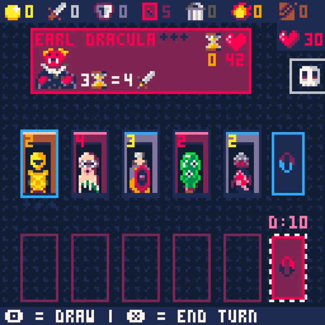 In Cards with Personalities Classic, players take on the role of a humble hero trying to assemble a team of great personalities to defeat the weird bosses that roam the lands. Each turn, you will play cards from your hand to gain Gold, Attack or other effects (like converting monsters to your side). You can spend Gold to acquire new cards from your deck. Attack is used to slay monsters, which earns you Gold and other cool effects. The battlefield is always changing so you have to adapt and come up with new strategies to defeat all eight bosses!