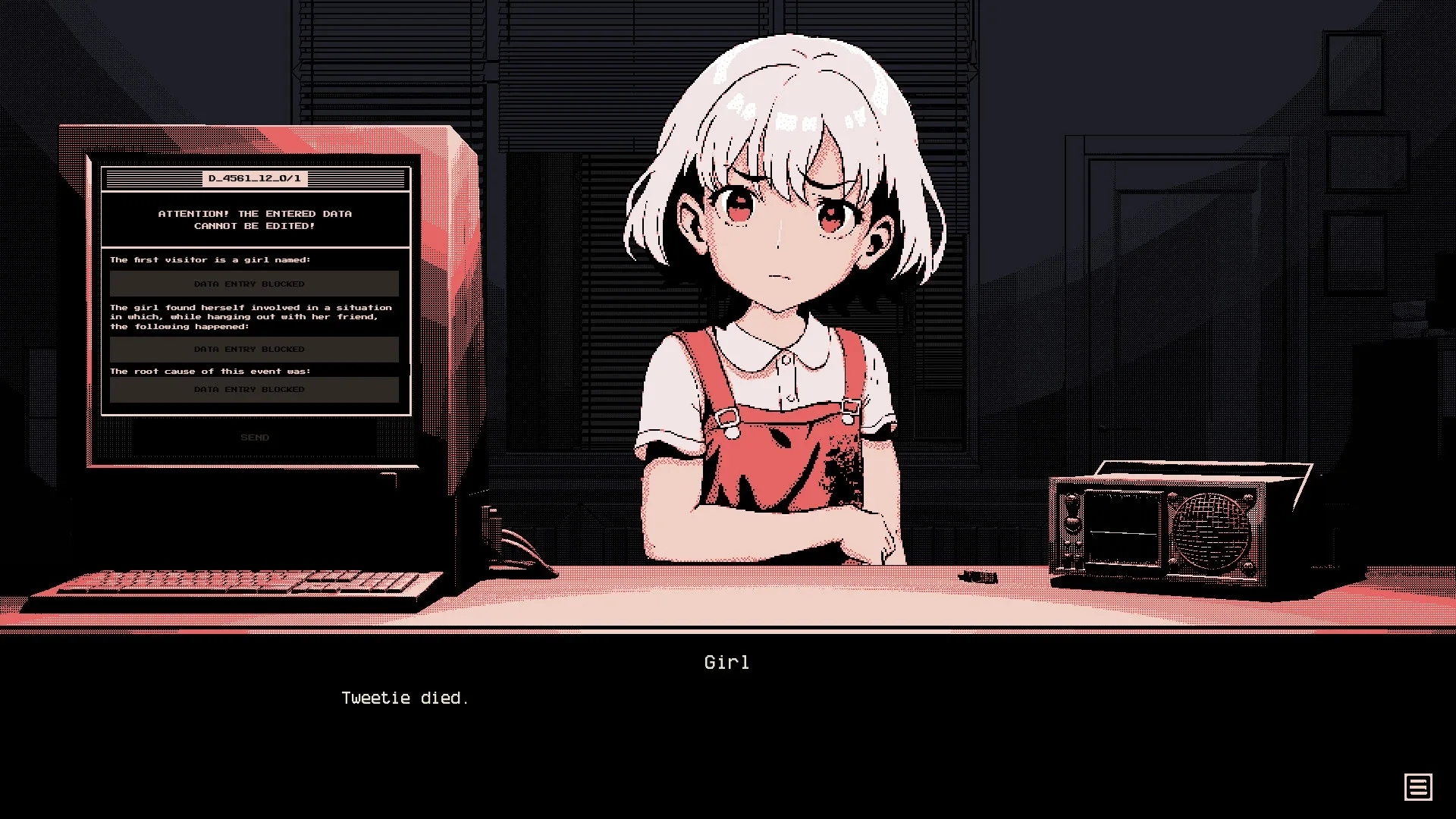 Outside the door is a mystic visual novel set within one office. You are about to figure out the stories of a few visitors without having a single memory of yourself.
