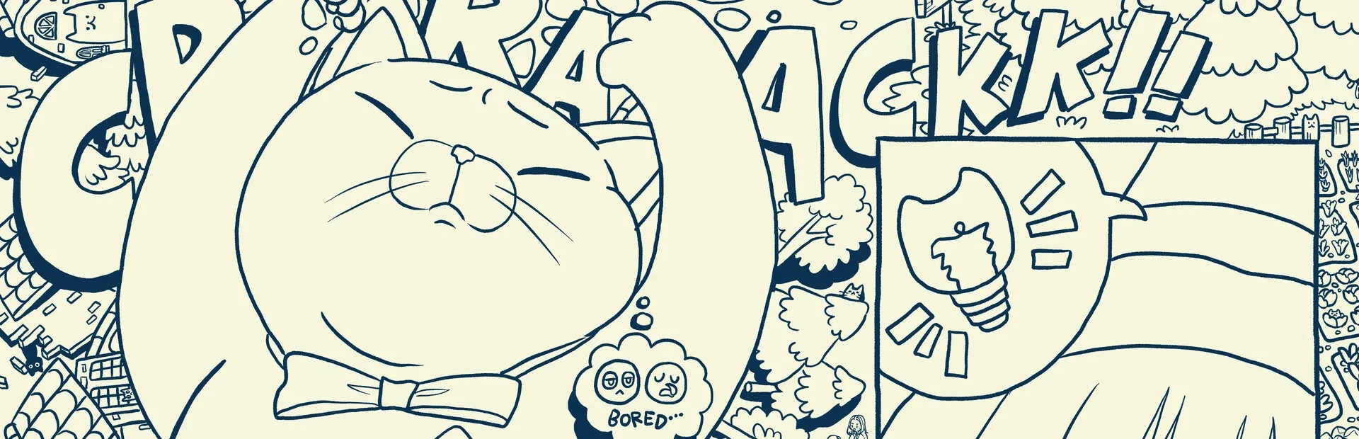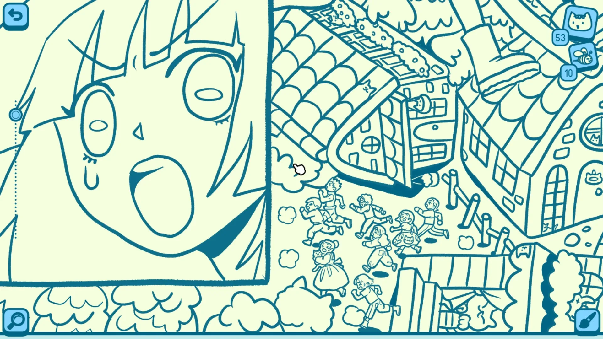 We've hidden numerous cats in a silent comic about a giant cat causing chaos in a village. Can you find all those cats?