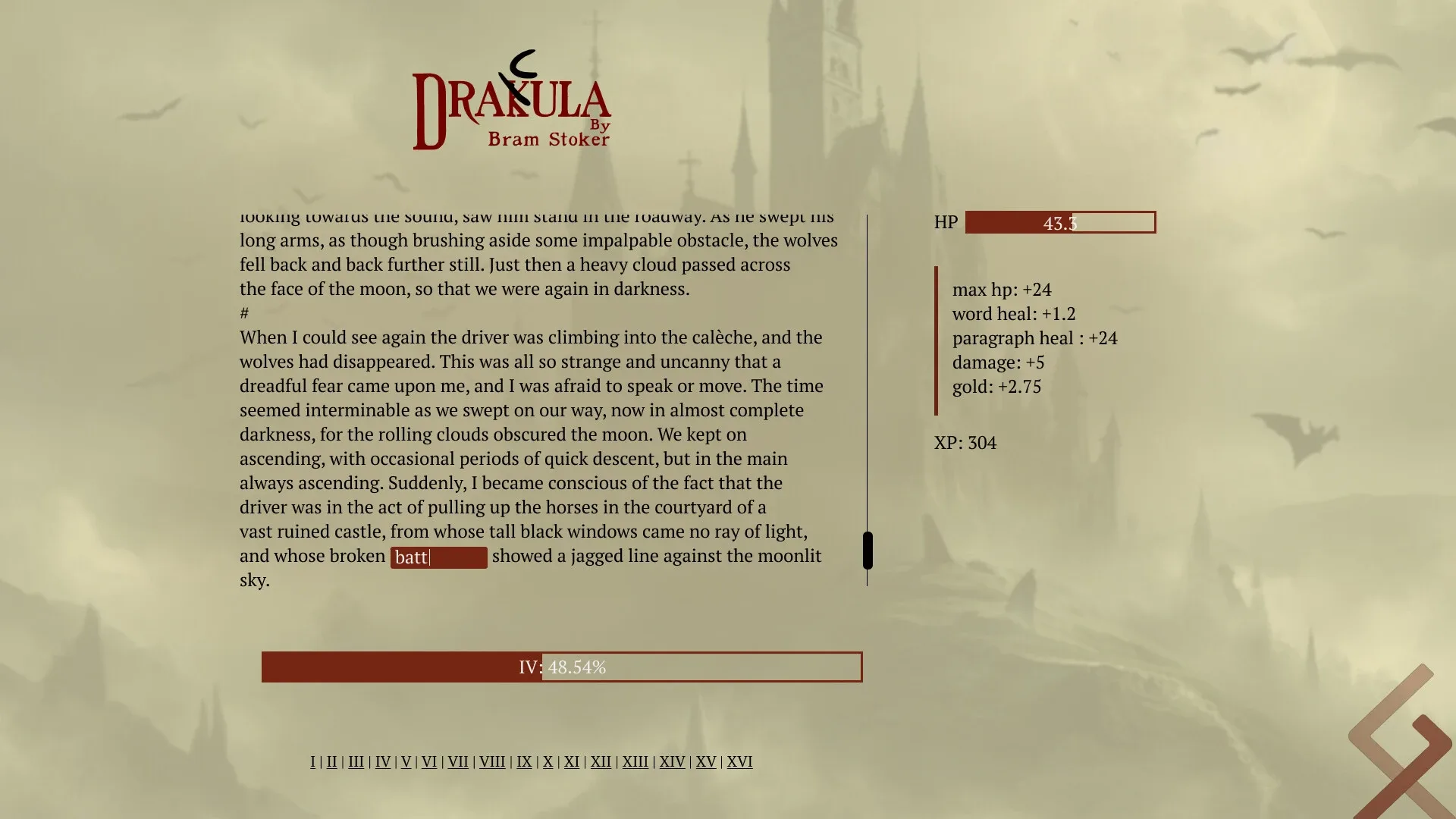 Drak(c)ula is a typing game where you type the horror novel Dracula by Bram Stoker.