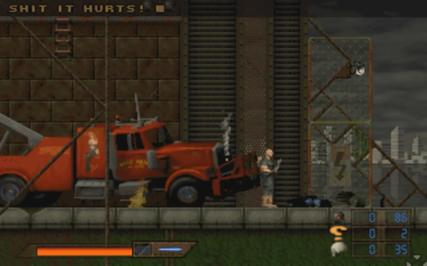 Eat This is a side-scrolling platformer in which the player controls a bald trucker named Leon. He has to fend off aliens invading the United States of America. Using various guns, rockets, and bombs the player has to kill aliens.