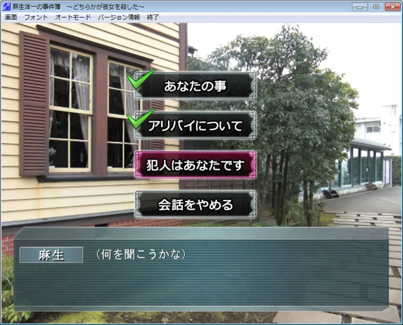 The victim is Yasuha Shirai, a girlwho lives in a mansion. She was shot dead in her bedroom. The suspects were two men who claimed to be her boyfriend. However, it is unclear which of the two killed her. Who is the culprit?
