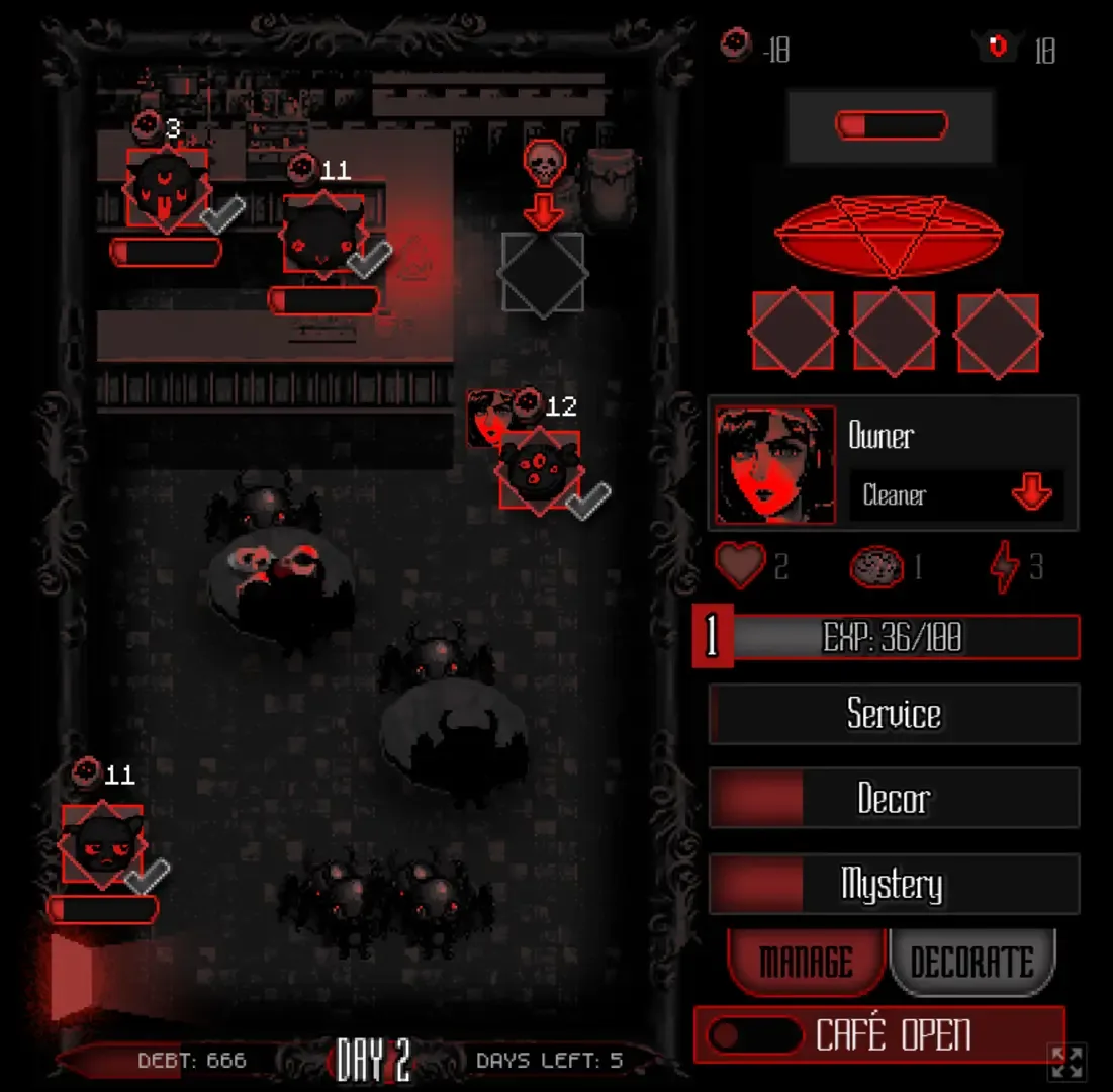 Summon demons to help you run your business, and work yourself to boost their performance. Decorate the interior, keep the place tidy and pick the best employees to fulfill your customers' needs!