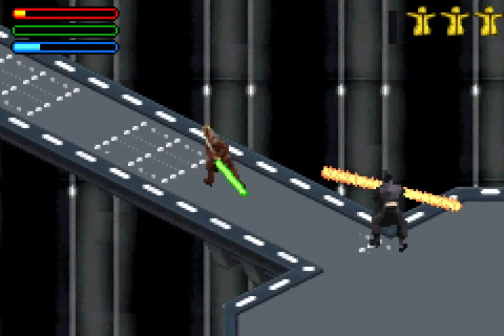 Star Wars: Jedi Power Battles follows the story of Episode I: The Phantom Menace. The Game Boy Advance port featured 3 playable characters as opposed to 5 on the PS1 and Dreamcast, with only Obi-Wan, Qui-Gon, and Mace Windu being playable. The game alternates between an isometric view and side-scrolling.