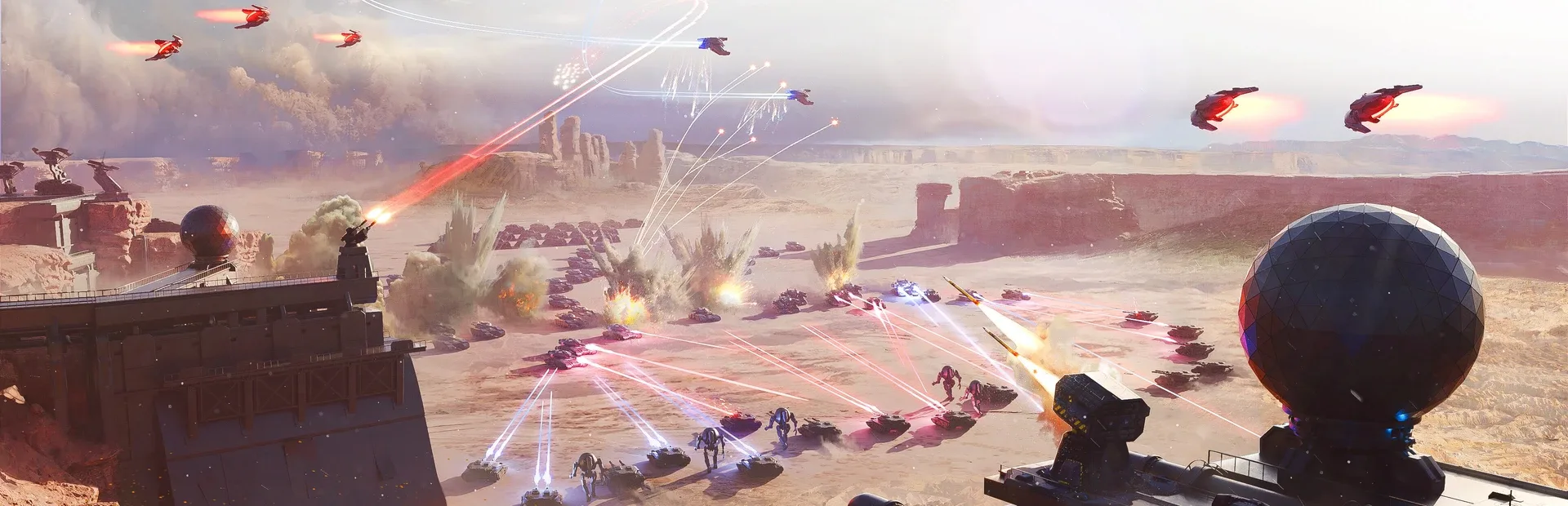 A sci-fi real-time strategy game with free form base building and all of the typical features found in classic RTS offerings. Construct a base, collect resources, build defenses, train an army, research technology and destroy the enemy. Manage your army with unit formations, patrol routes and attack groups, reveal the enemy through fog of war, monitor the battlefield with radar, one-click support abilities, unique unit attacks, hero units, etc. Combat balanced with a rock-paper-scissor approach to unit balance.