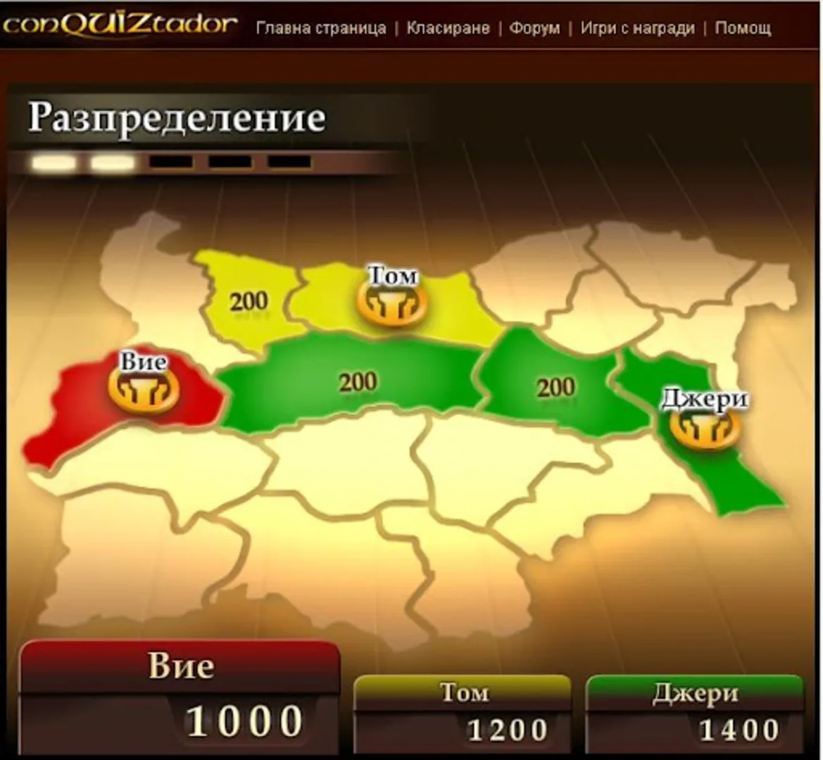 ConQUIZtador is a browser quiz strategy game. It is the worldwide version of the hungarian game "Honfoglalló". In some countries it is called "Triviador". In the game, the player has to answer trivia questions against three opponents in order to occupy the most territories on a country's map.